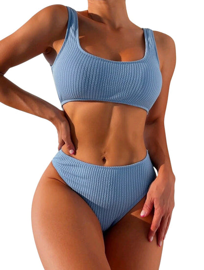 Címke nélküli, világoskék, bordázott szövet, testhezálló, szögletes nyakú top, magas derekú alsó.