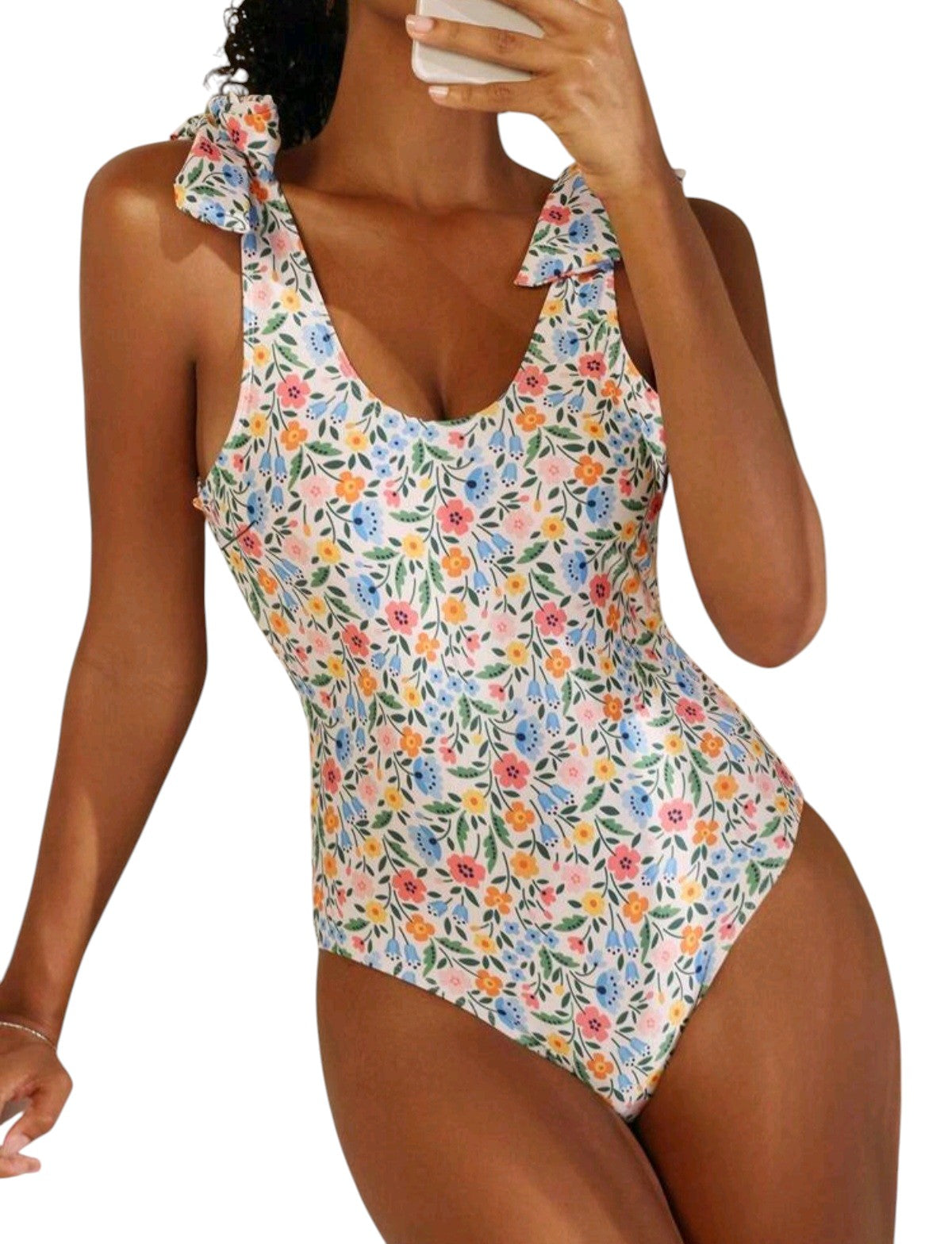 SHE fehér virágmintás megkötős pántú egyberészes fürdőruha