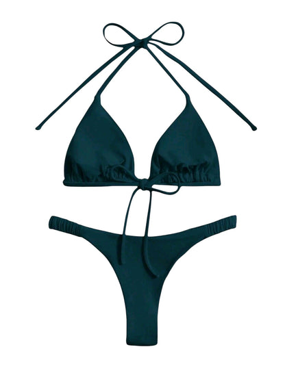 Címke nélküli, sötétzöld/teal, szövet, testhezálló, háromszög (halter) nyak, vékony megkötős pántok, alacsony derék, tanga fazonú alsó.
