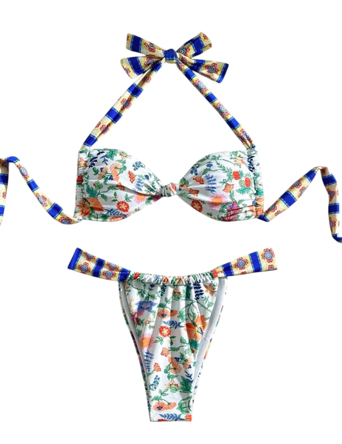 Címke nélküli, fehér alapon többszínű virágminta, elasztikus fürdőruha anyag, pántnélküli (bandeau) stílusú, nyakba kötős, masnis felső, normál szabású alsó, kontrasztos csíkos pántokkal.