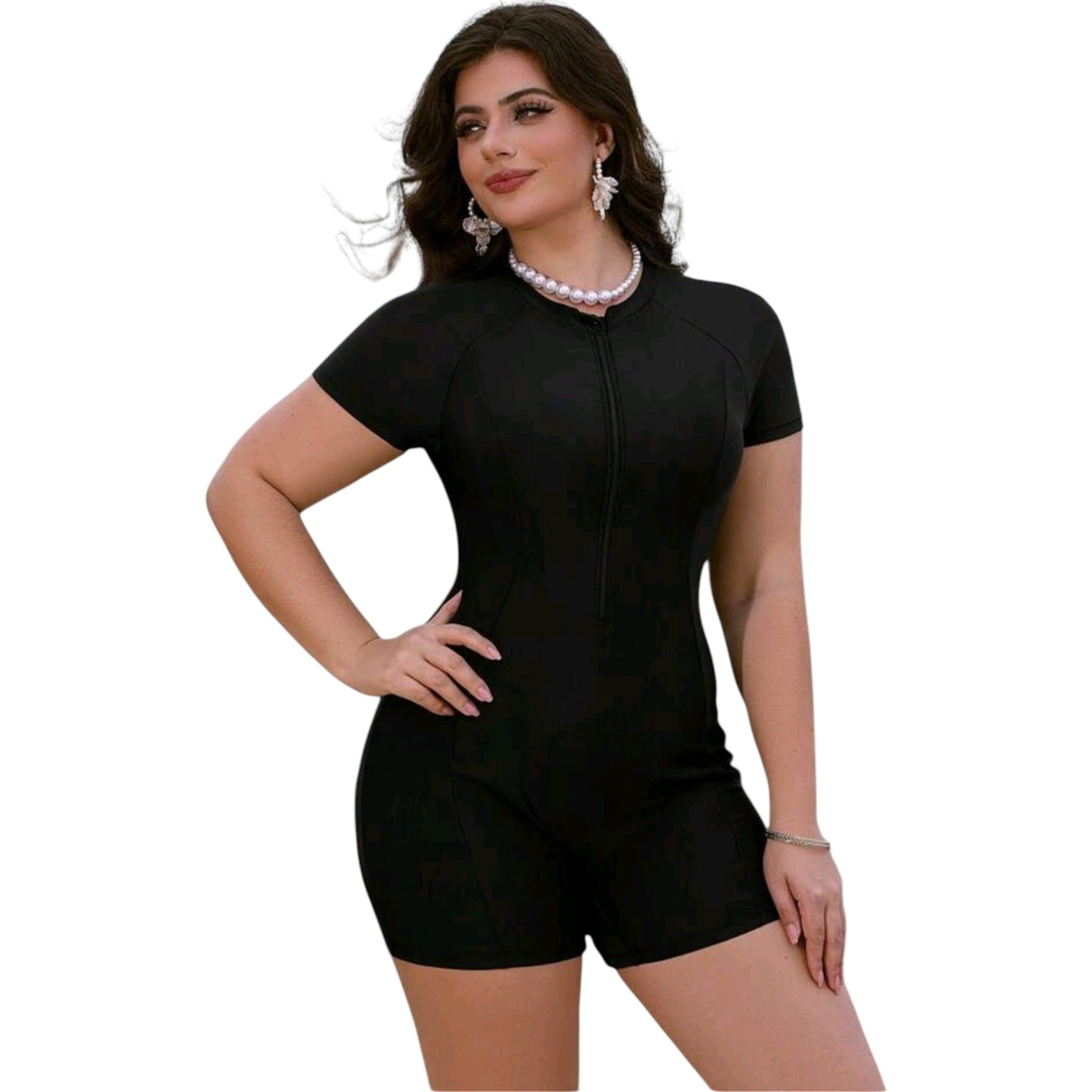 Címke nélküli, fekete, rövid ujjú, cipzáras, egyrészes