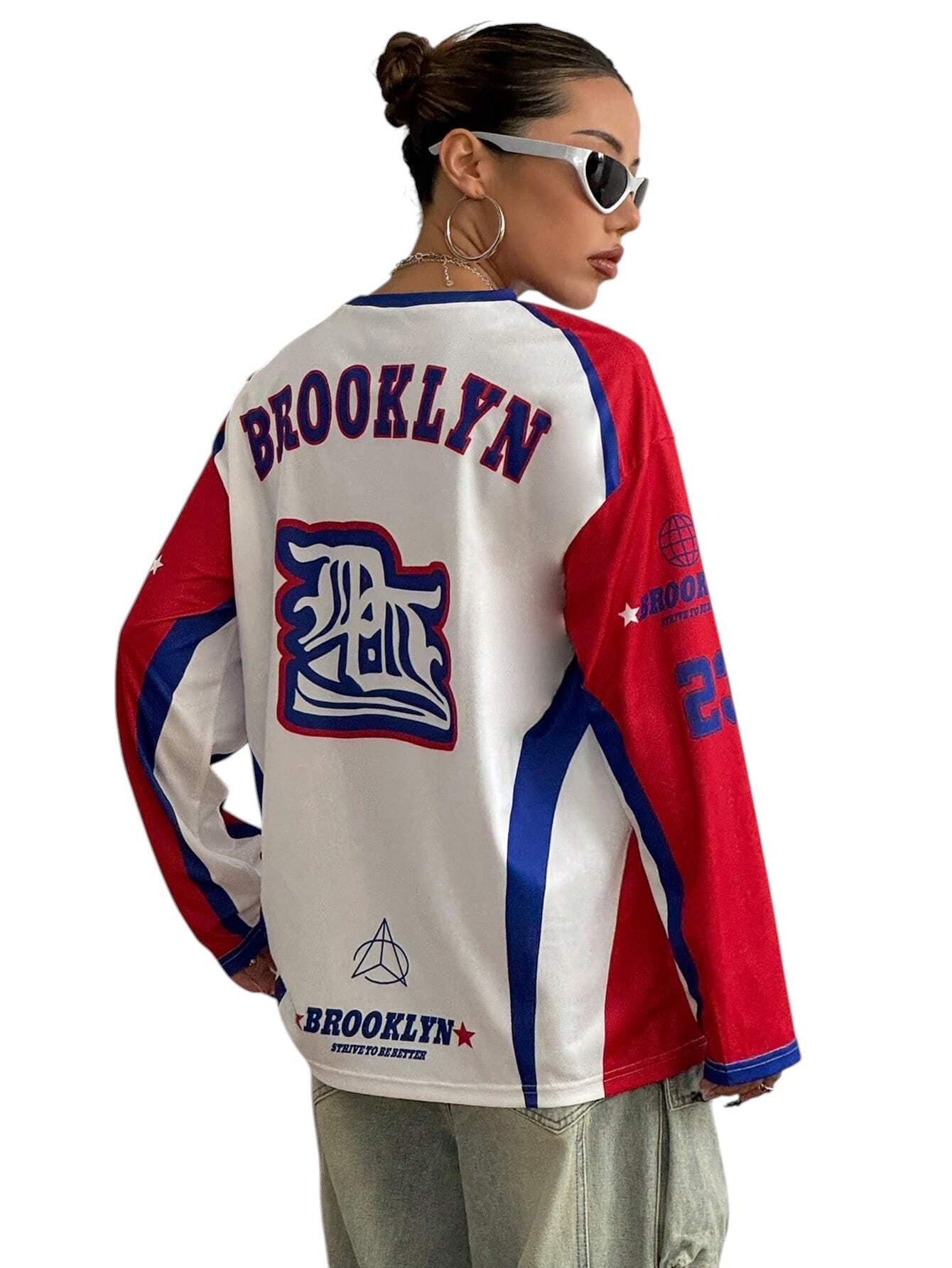 SHE fehér, piros és kék feliratos hosszú ujjú póló