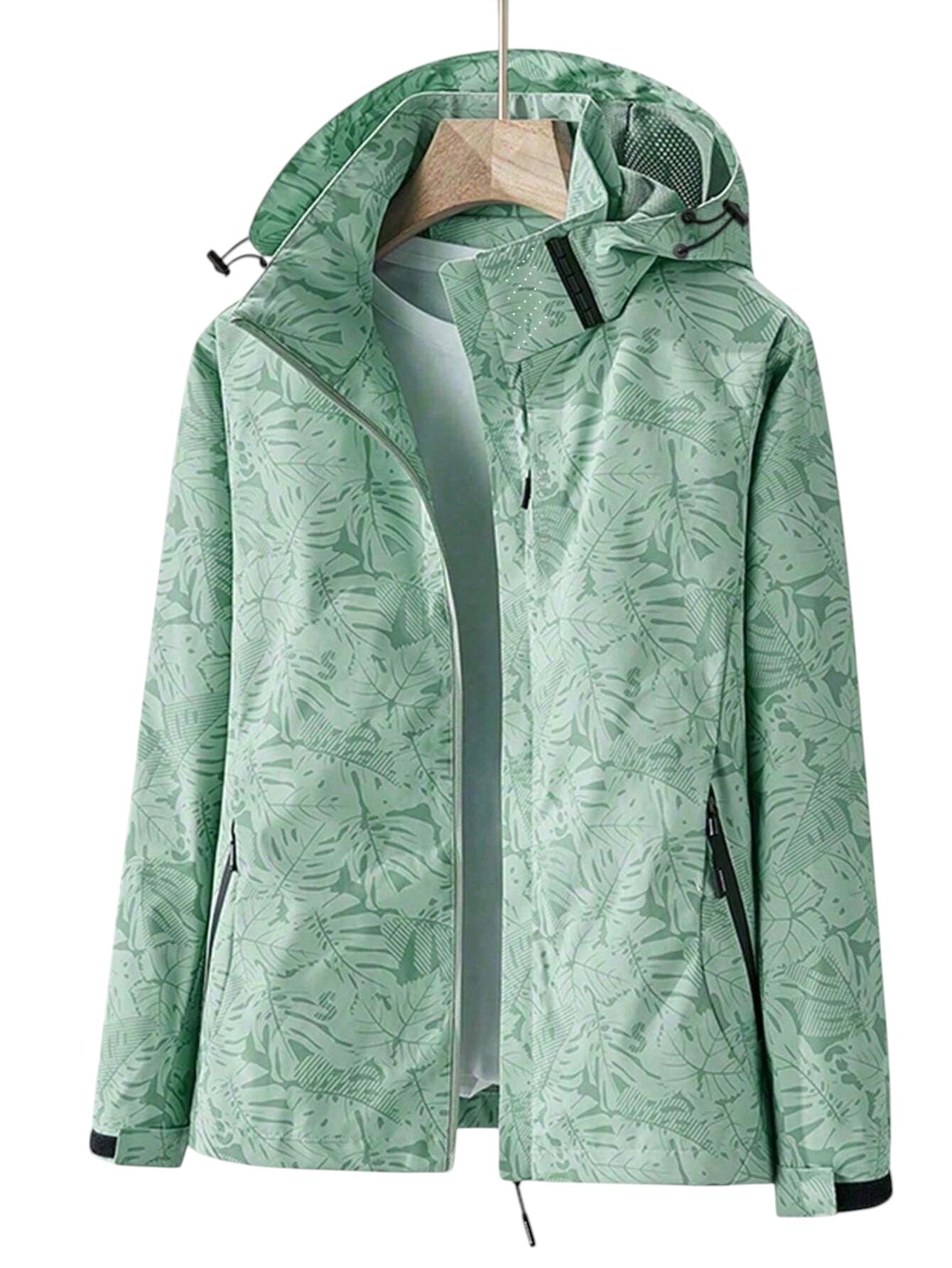 Címke nélküli, világoszöld alapon sötétebb zöld levélmintás, kapucnis, cipzáras széldzseki