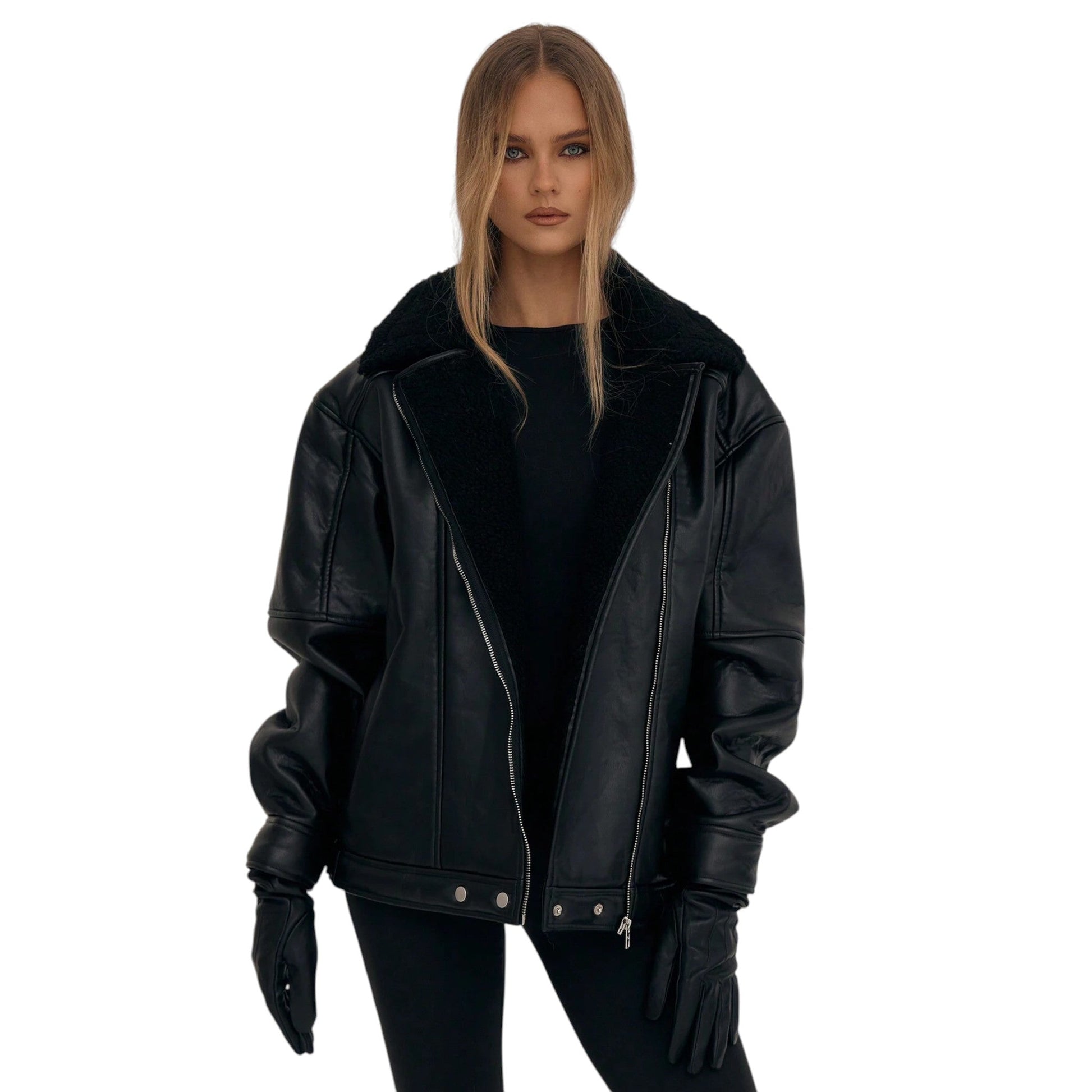 Címke nélküli, fekete, cipzáras, műbőr pilóta dzseki, műszőrme gallérral.