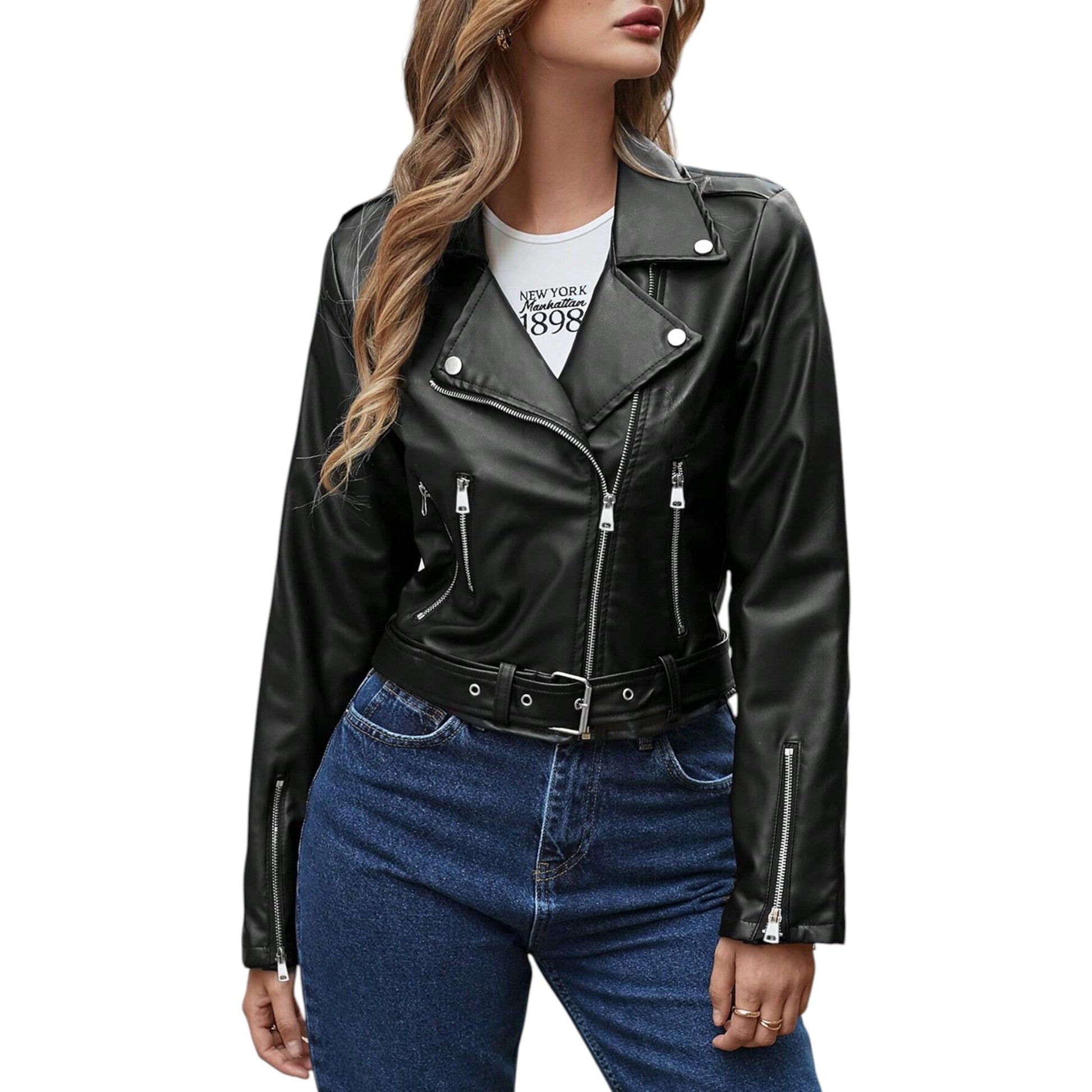 Címke nélküli, fekete, rövid fazonú, cipzáras, öves műbőr dzseki.