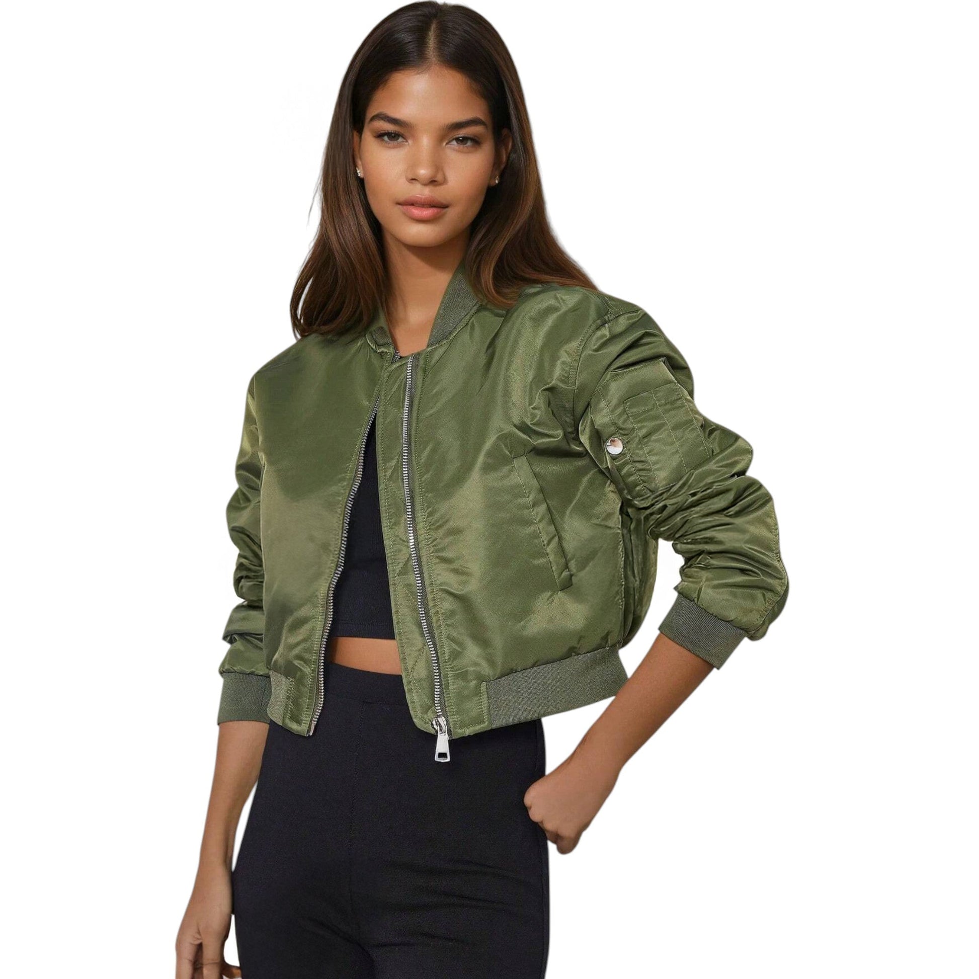 Címke nélküli, khaki zöld, hosszú ujjú, cipzáras bomber dzseki.