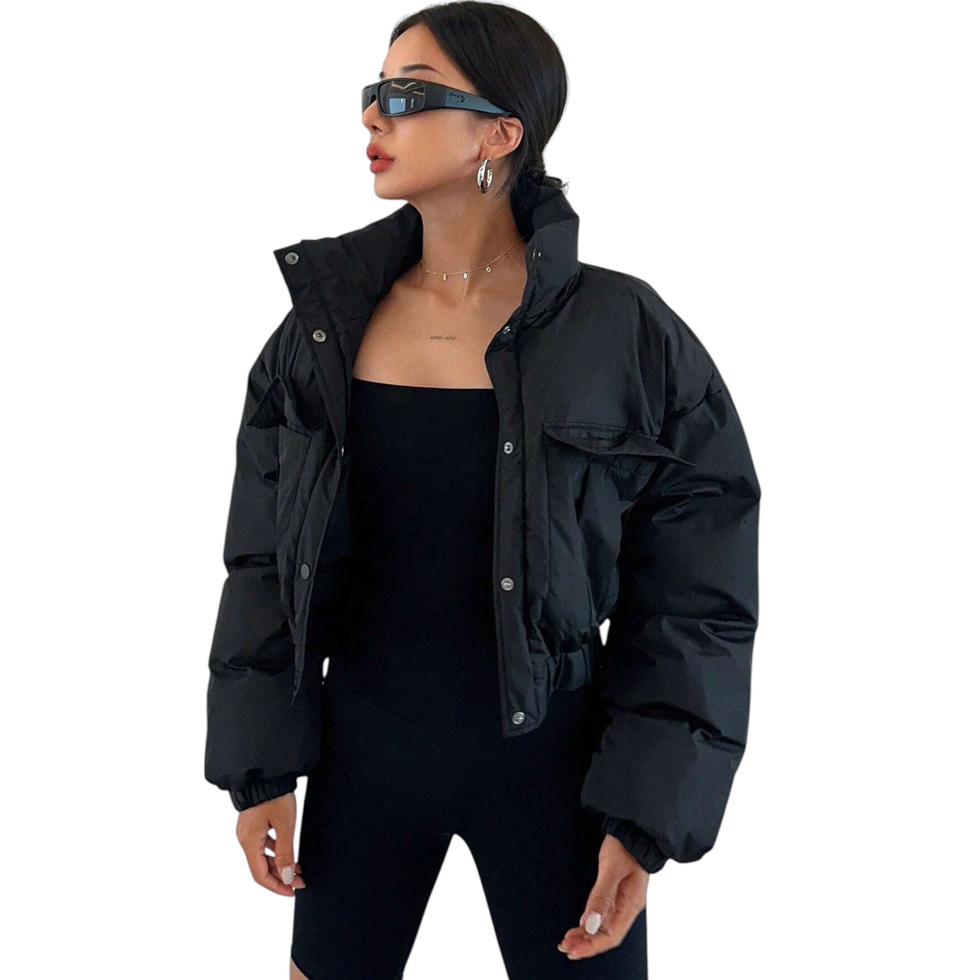 Címke nélküli, fekete, állógalléros, gombos, rövid puffos kabát.