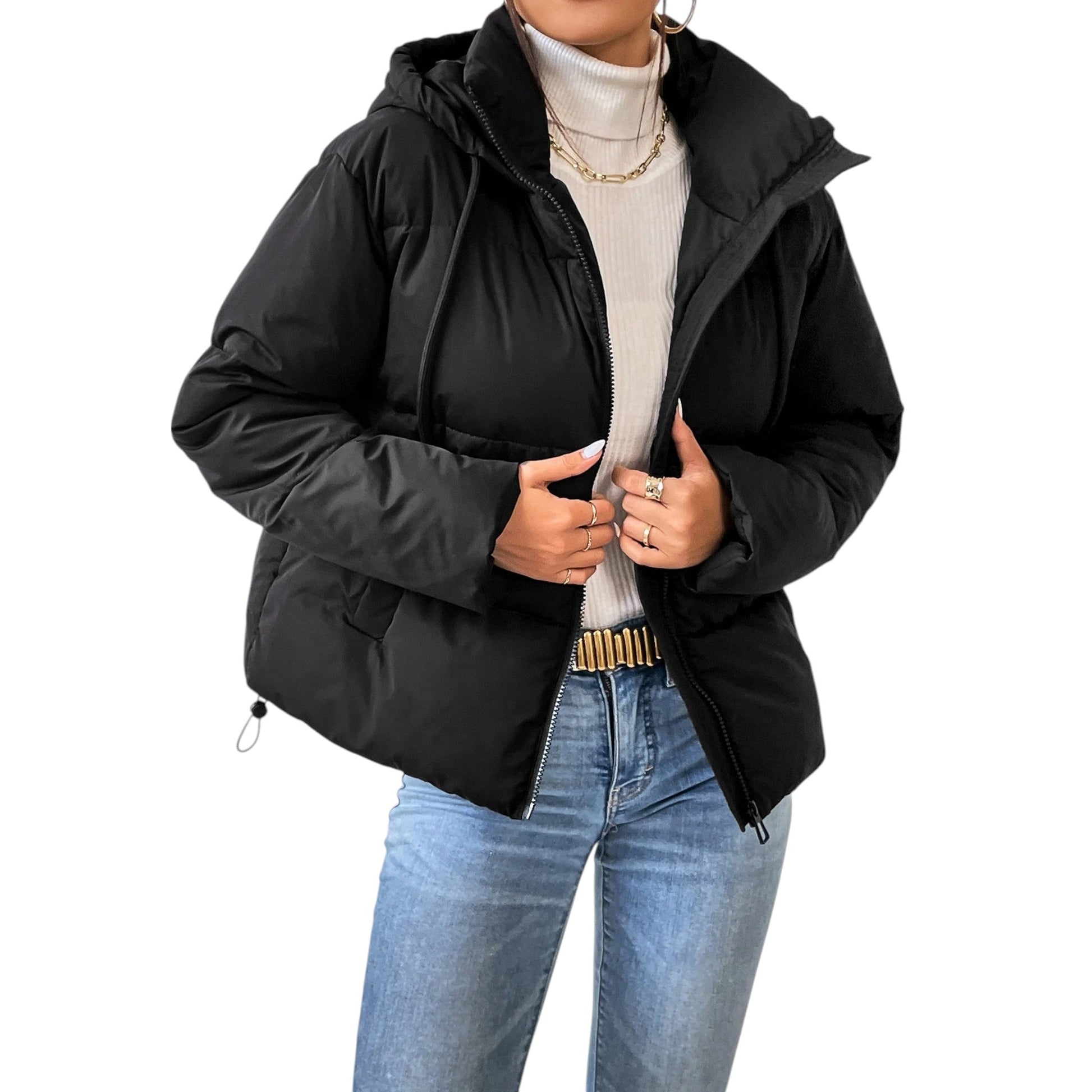 Címke nélküli, fekete színű, rövid fazonú, cipzáras és kapucnis puffer dzseki.
