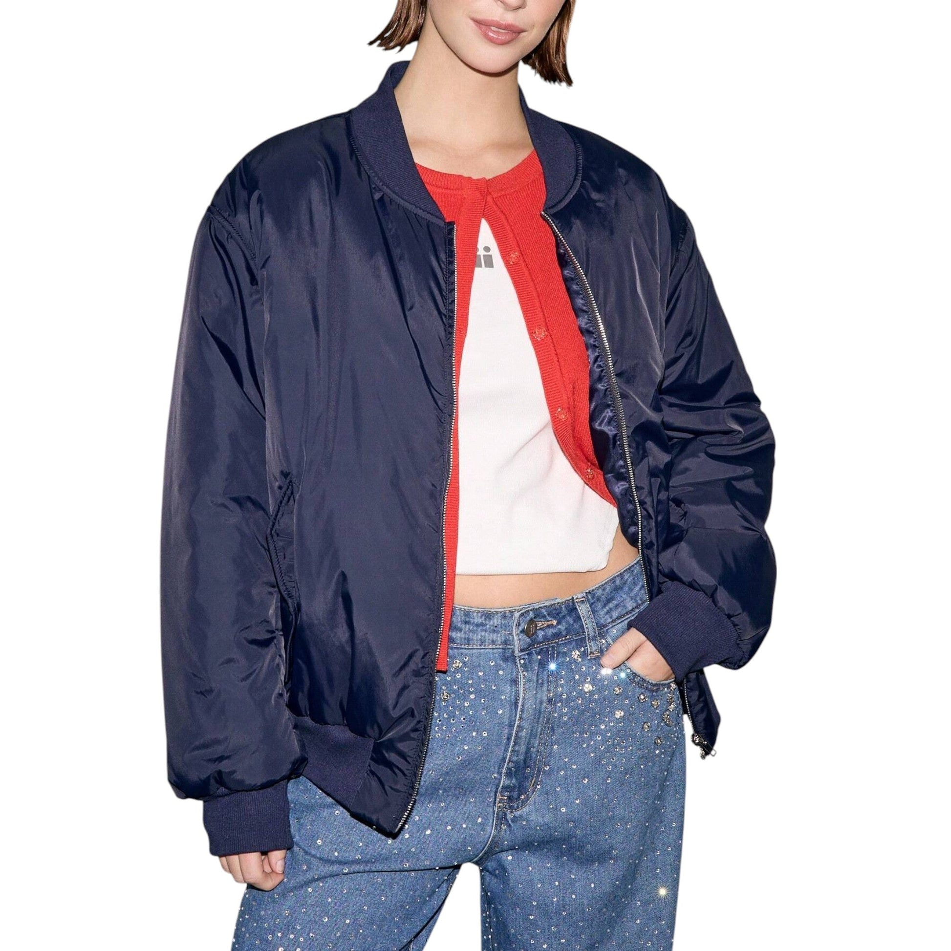 Címke nélküli, sötétkék, hosszú ujjú, cipzáros bomber dzseki, bordázott passzéval a derékon, galléron és mandzsettán.