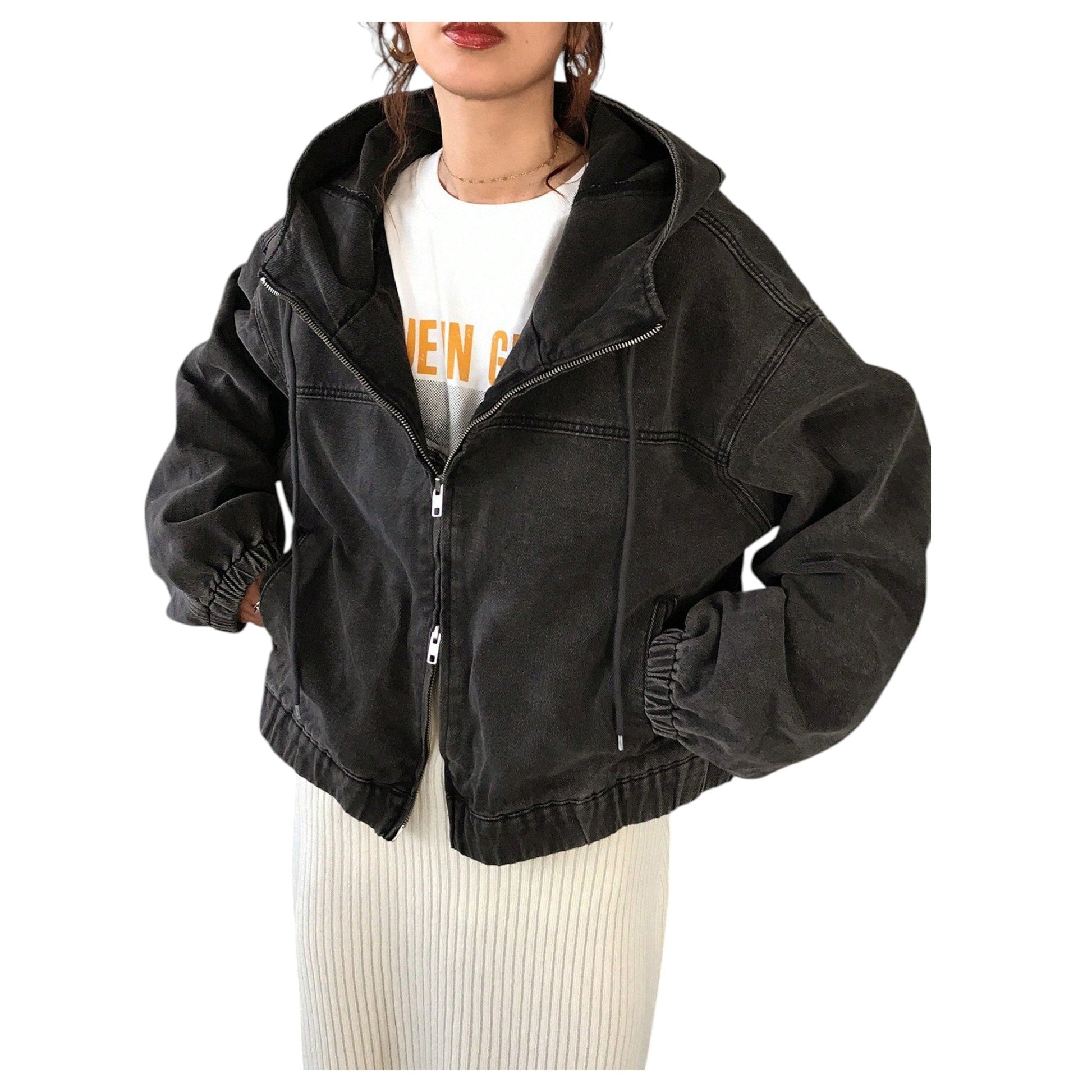 Címke nélküli, fekete, kapucnis, hosszú ujjú farmer dzseki, elöl cipzárral, gumírozott mandzsettával és derékkal, ejtett vállakkal.