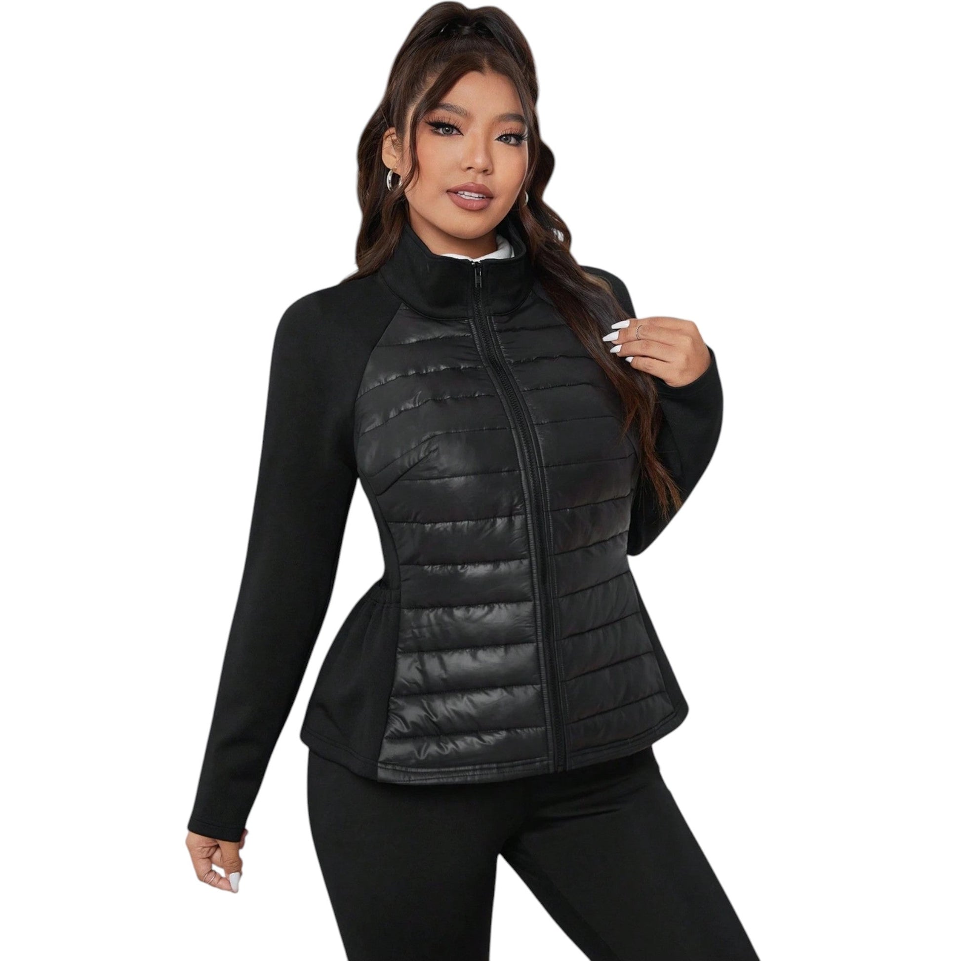 Címke nélküli, fekete, steppelt dzseki, hosszú ujjú, cipzáros elől, magasított nyakú.