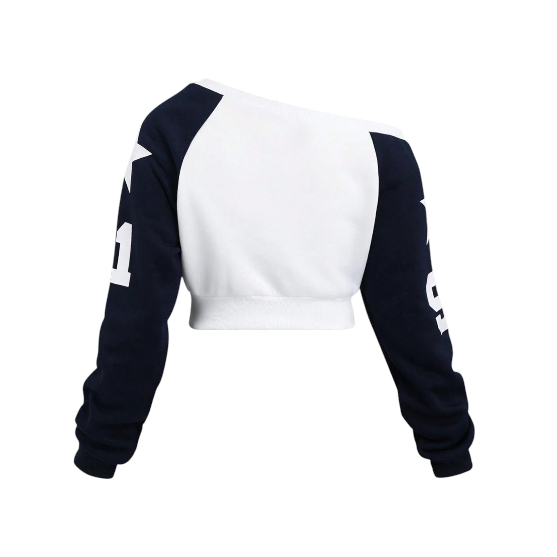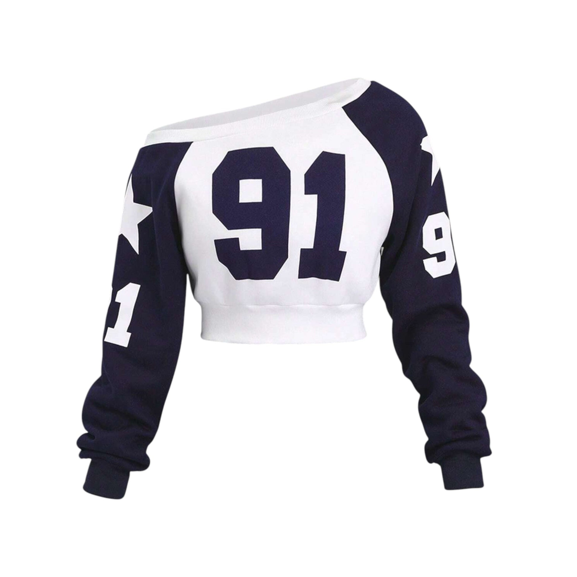 Címke nélküli, fehér és sötétkék, félvállas, hosszú ujjú, "91" feliratú és csillag mintás crop felső.