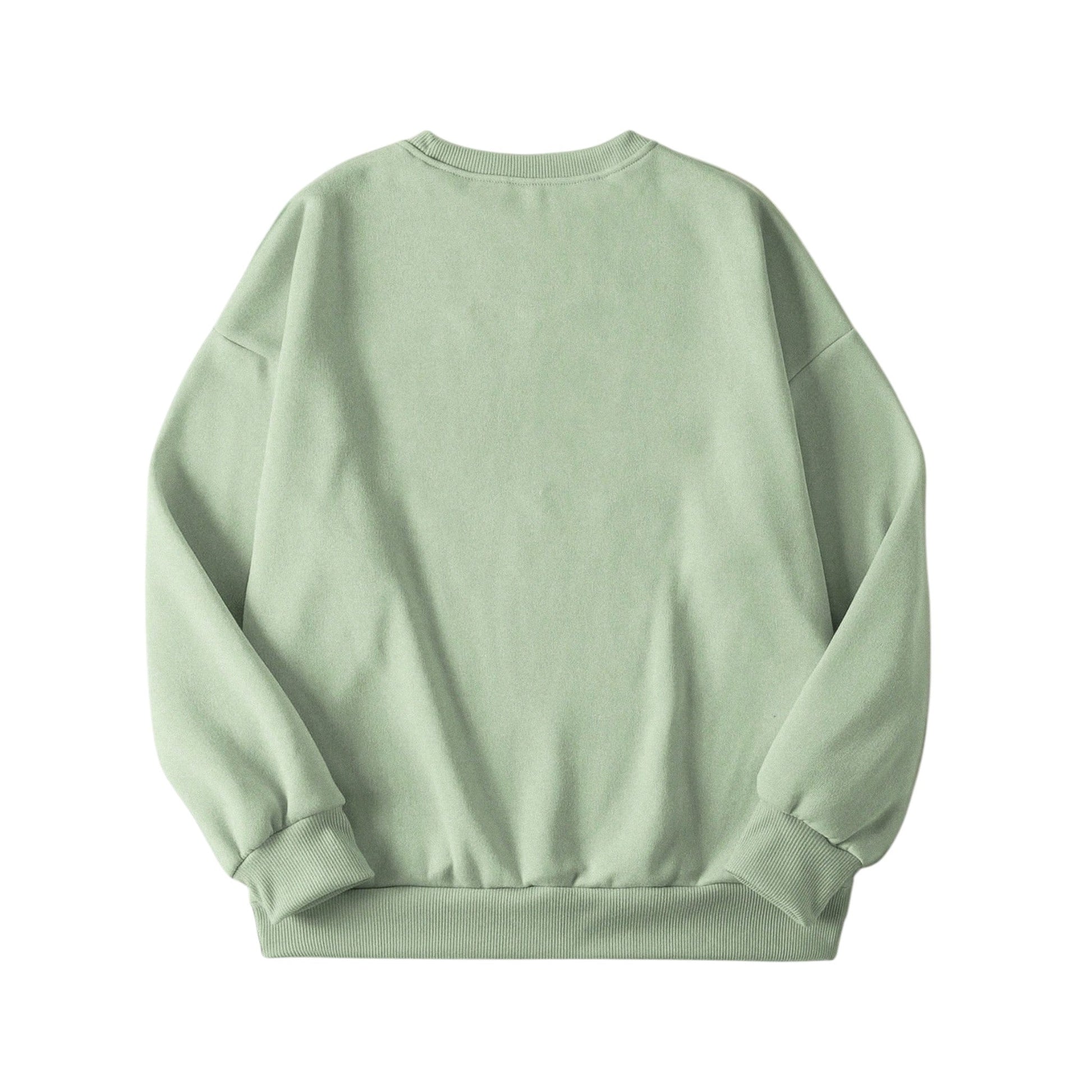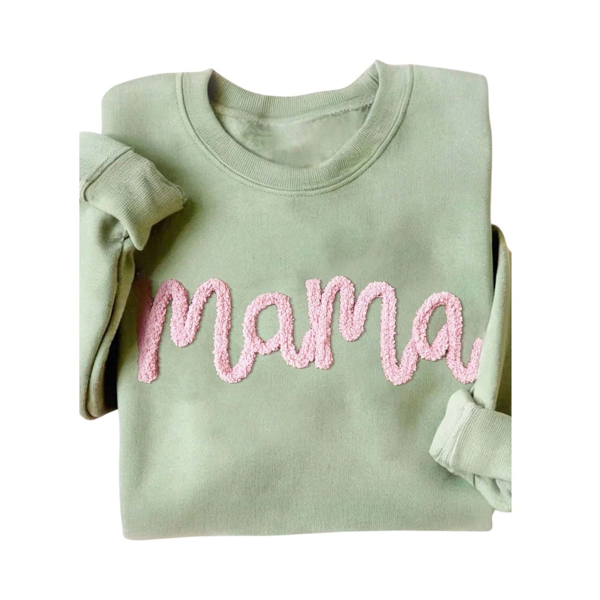 Címke nélküli, khaki zöld, kerek nyakú, hosszú ujjú pulóver, rózsaszín "Mama" felirattal.