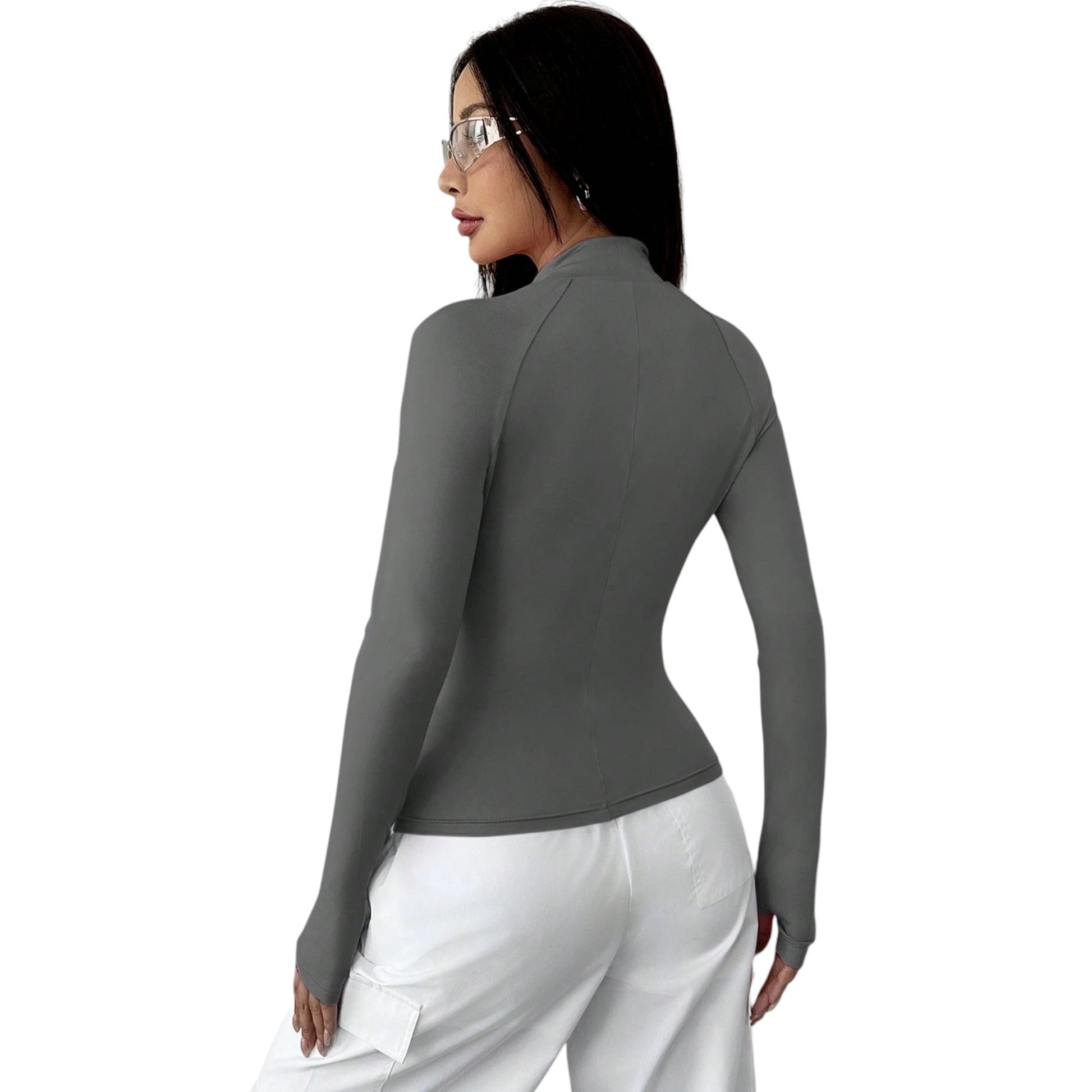 Címke nélküli, szürke, hosszú ujjú, magas nyakú, elöl cipzáros záródás, testhezálló fazon.