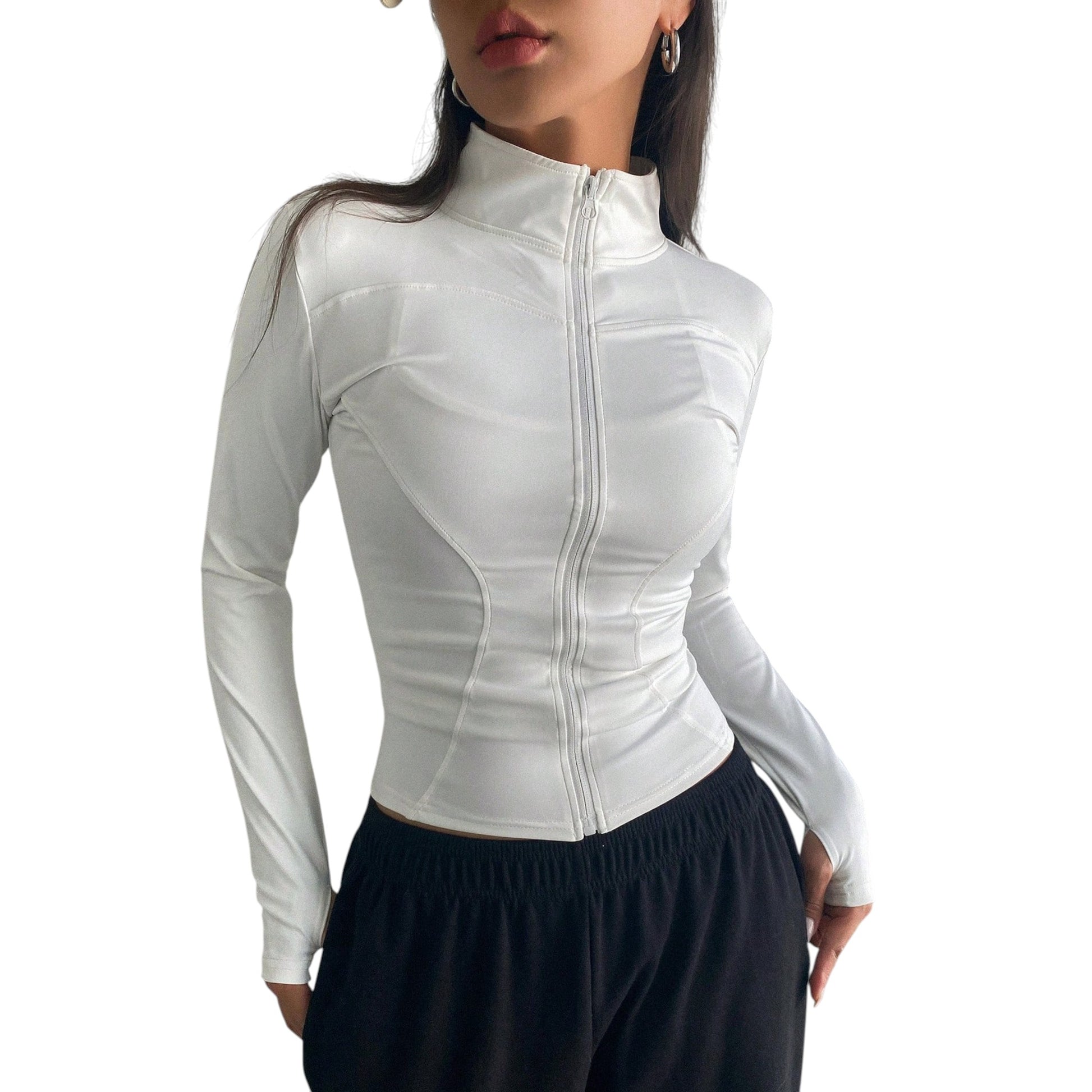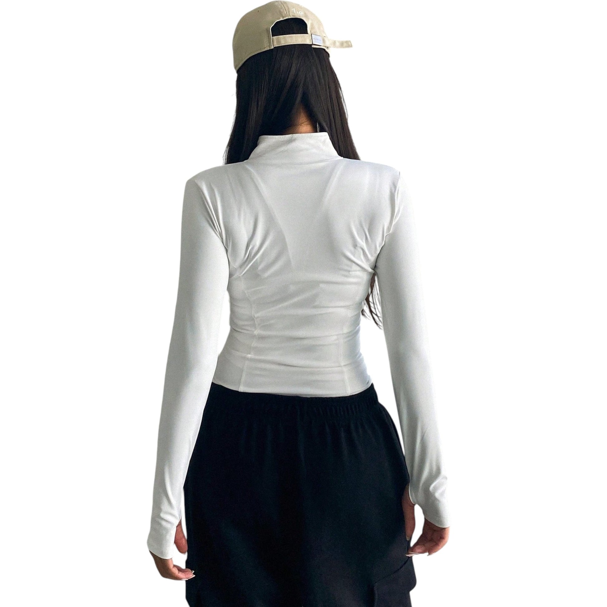 Címke nélküli, ekrü, hosszú ujjú, cipzáros, magas nyakú, testhezálló felső.