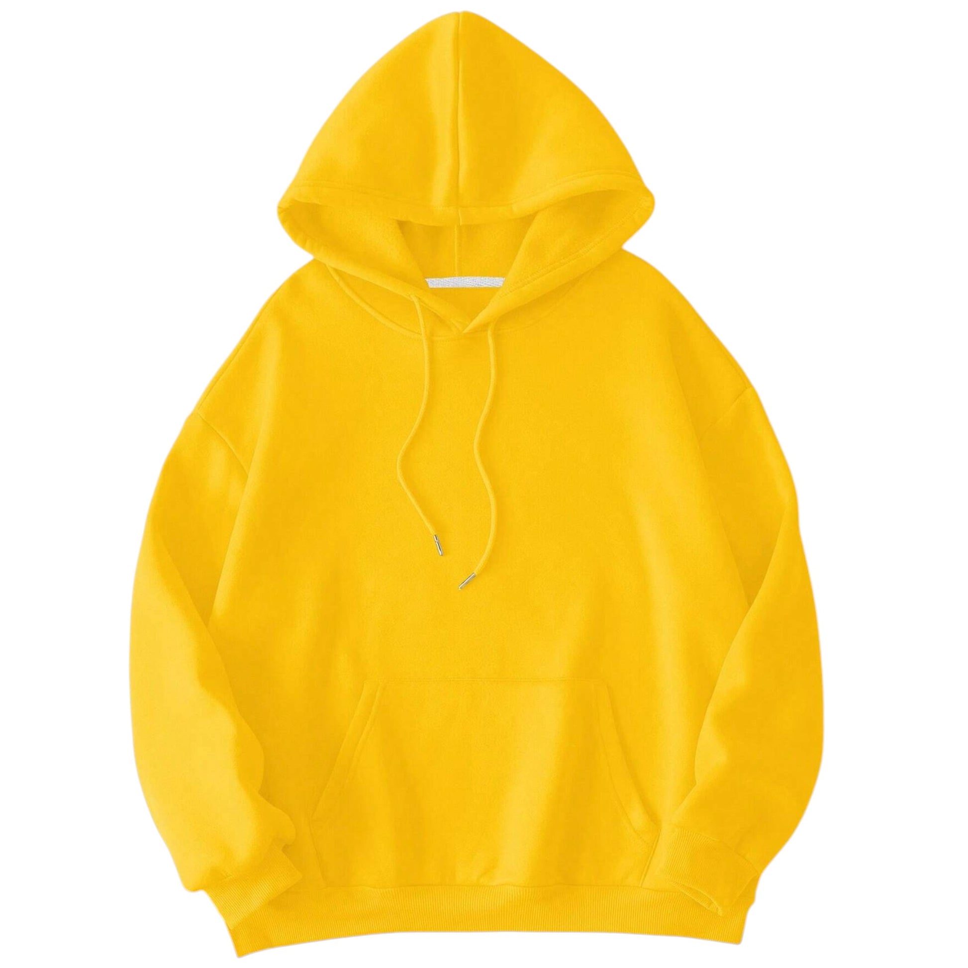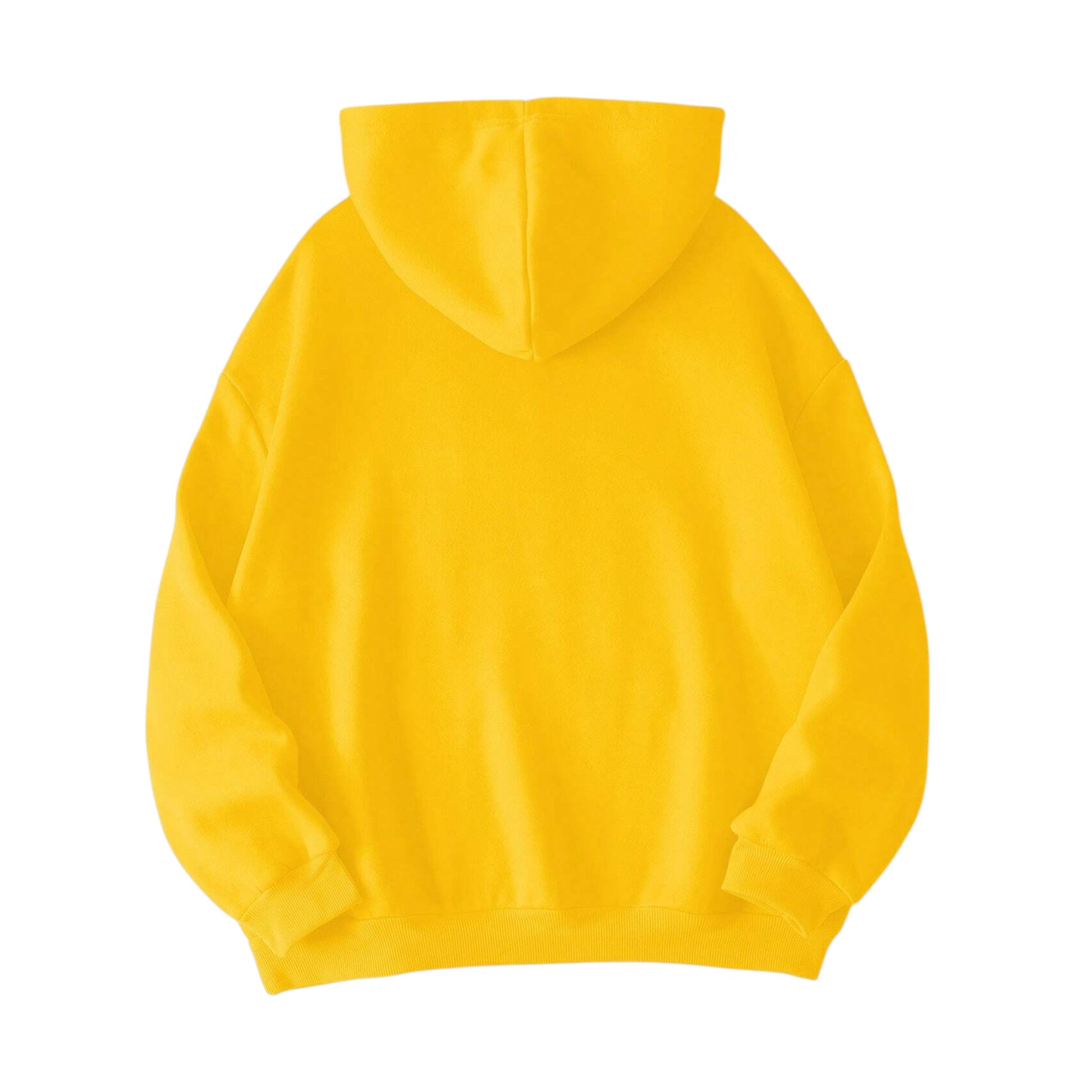 Címke nélküli, sárga, kapucnis, kenguru zsebes, húzózsinóros, bordázott passzéval ellátott pulóver.