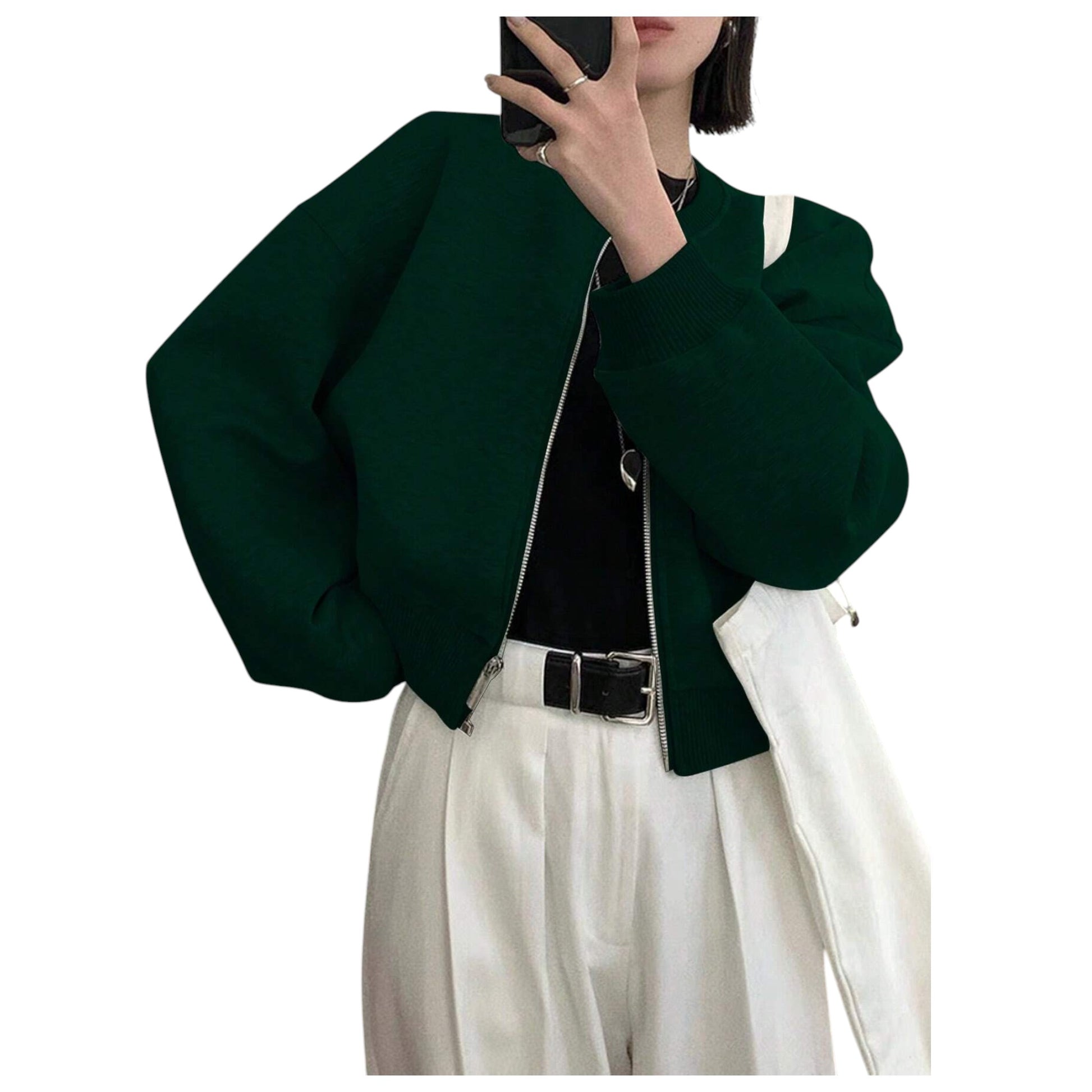 Címke nélküli, zöld, crop fazonú, bomber, elöl cipzáras, bordázott passzéval az alján és az ujjak végén.