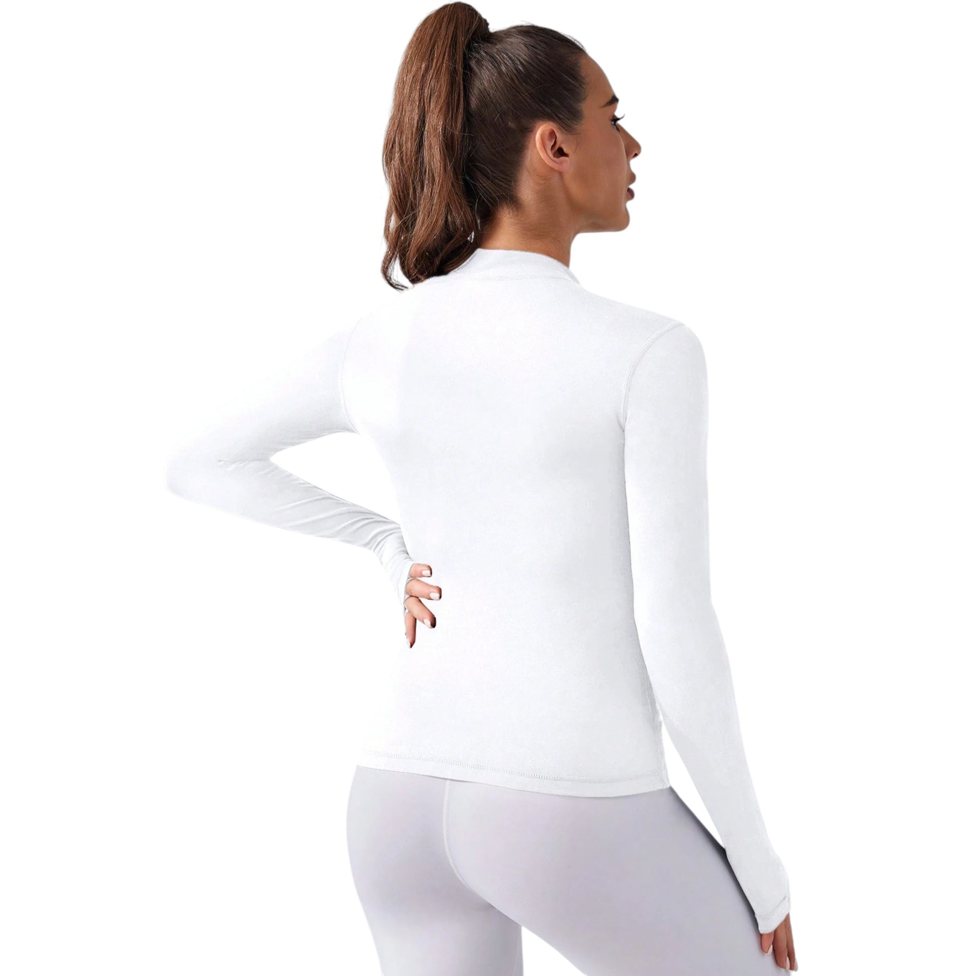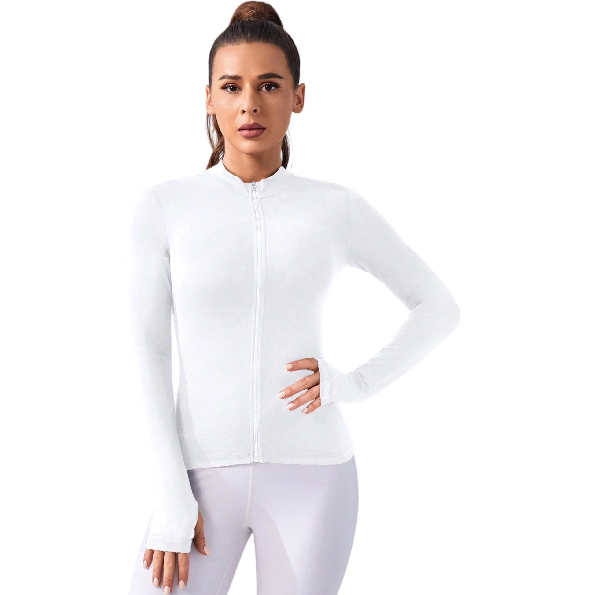 Címke nélküli, ekrü, hosszú ujjú, magas nyakú, cipzáros, ujján hüvelykujj bújtatós, sportos pulóver.