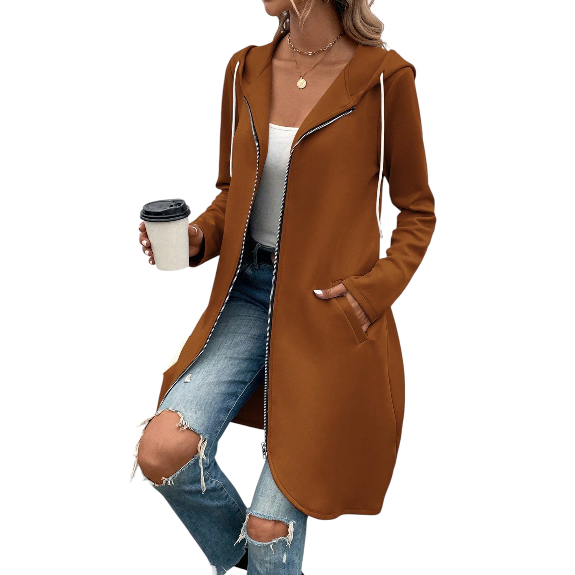 Címke nélküli, barna, hosszú ujjú, hosszú kabát, kapucnival és elöl cipzárral.