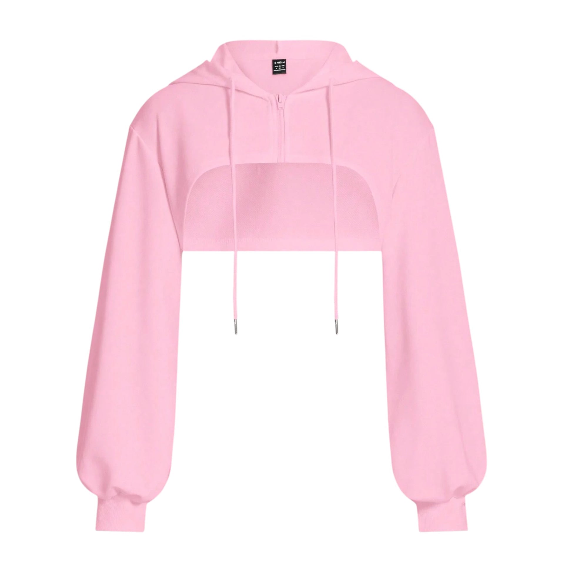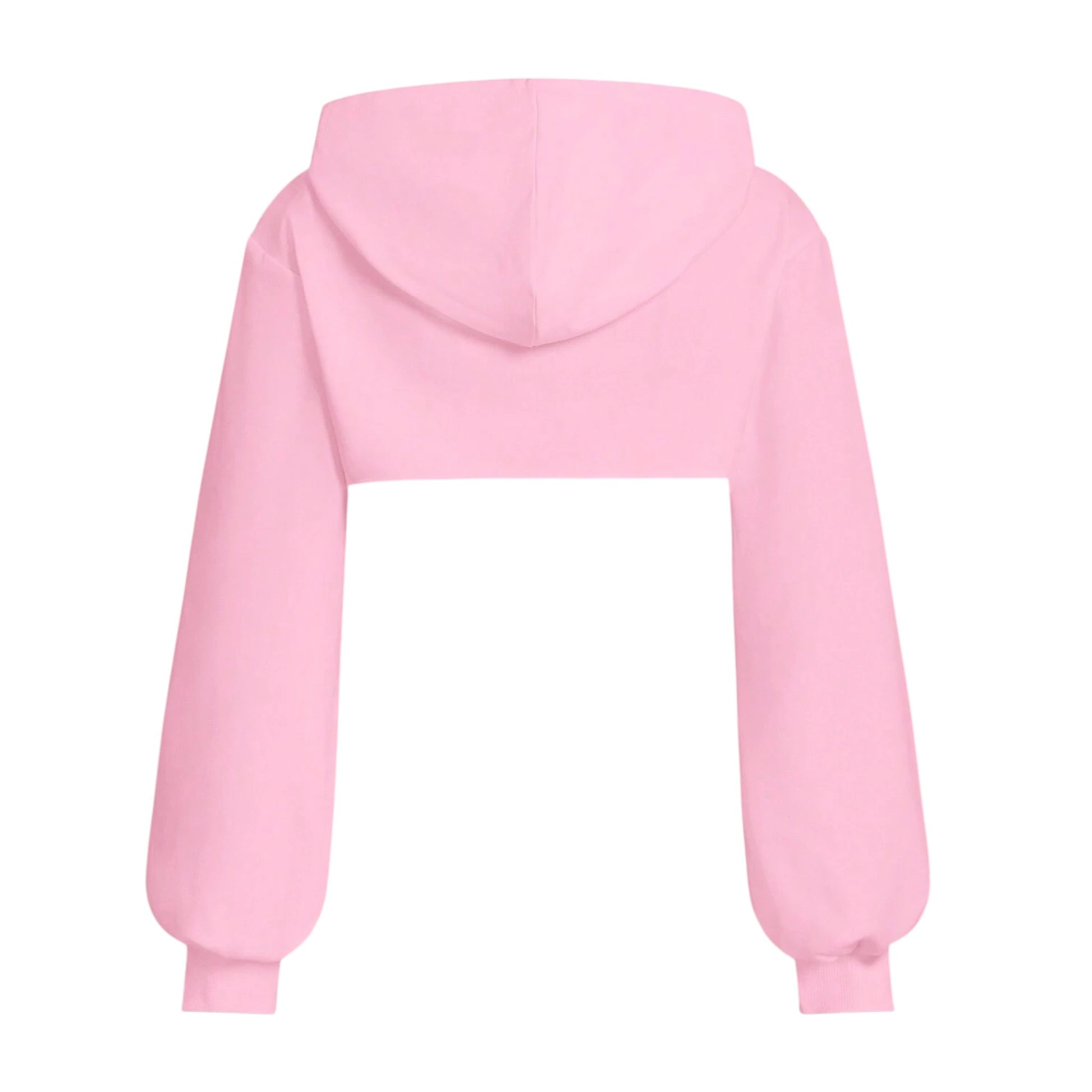 Címke nélküli, rózsaszín, kapucnis, hosszú ujjú crop pulóver, elöl cipzárral és megkötővel.