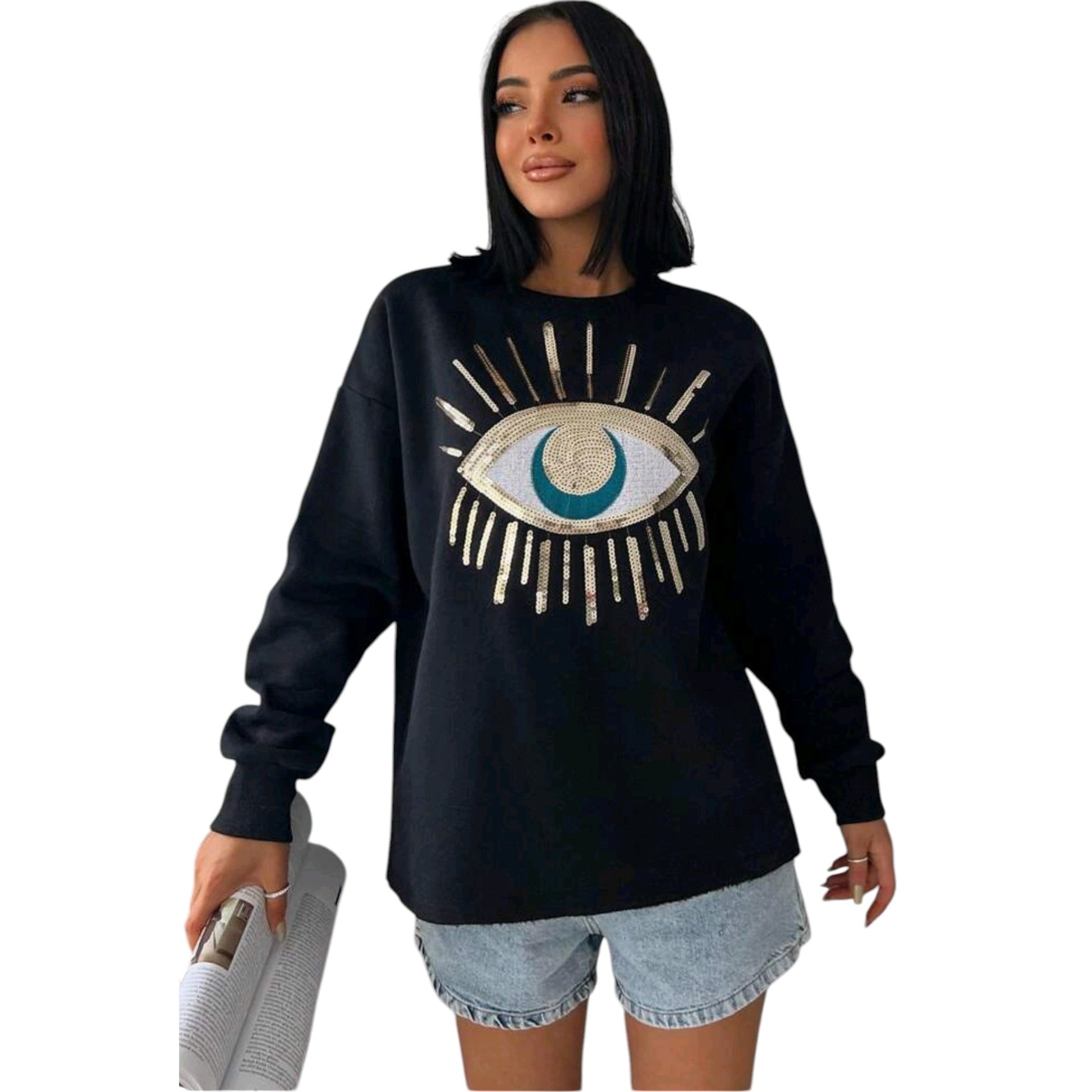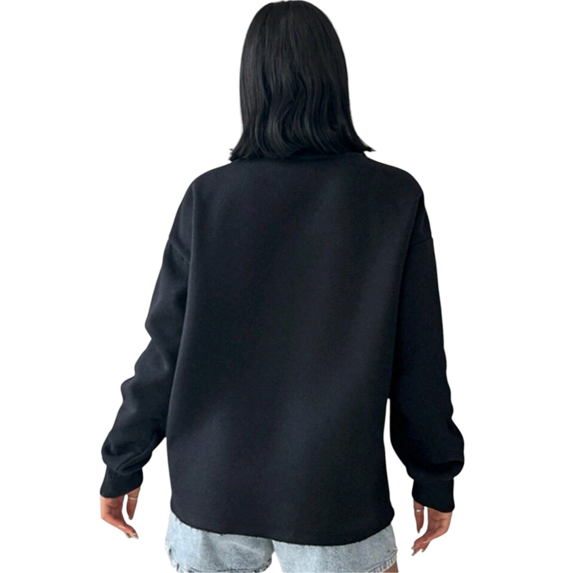 Címke nélküli, fekete, hosszú ujjú, mintás, kerek nyakú pulóver.