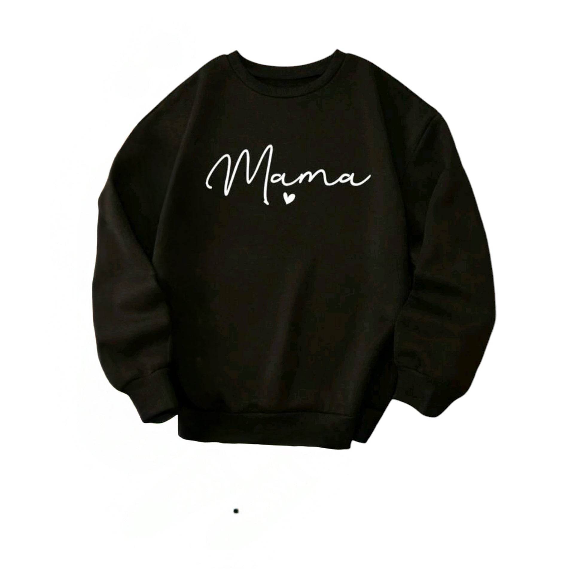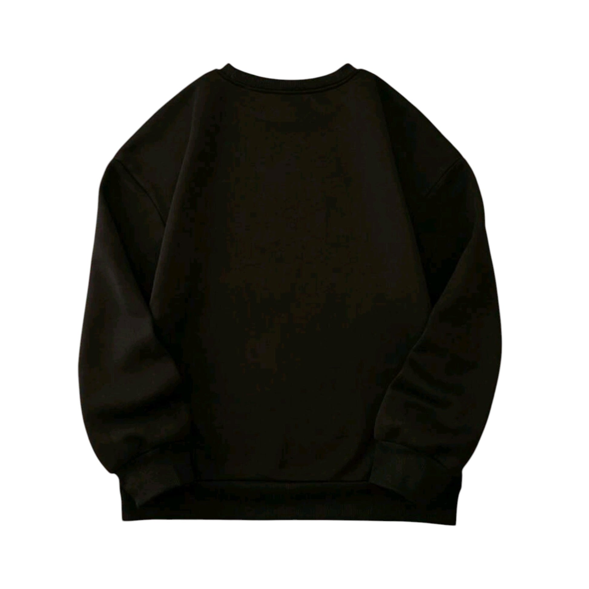 Címke nélküli, fekete, feliratos, hosszú ujjú, kerek nyakú pulóver.