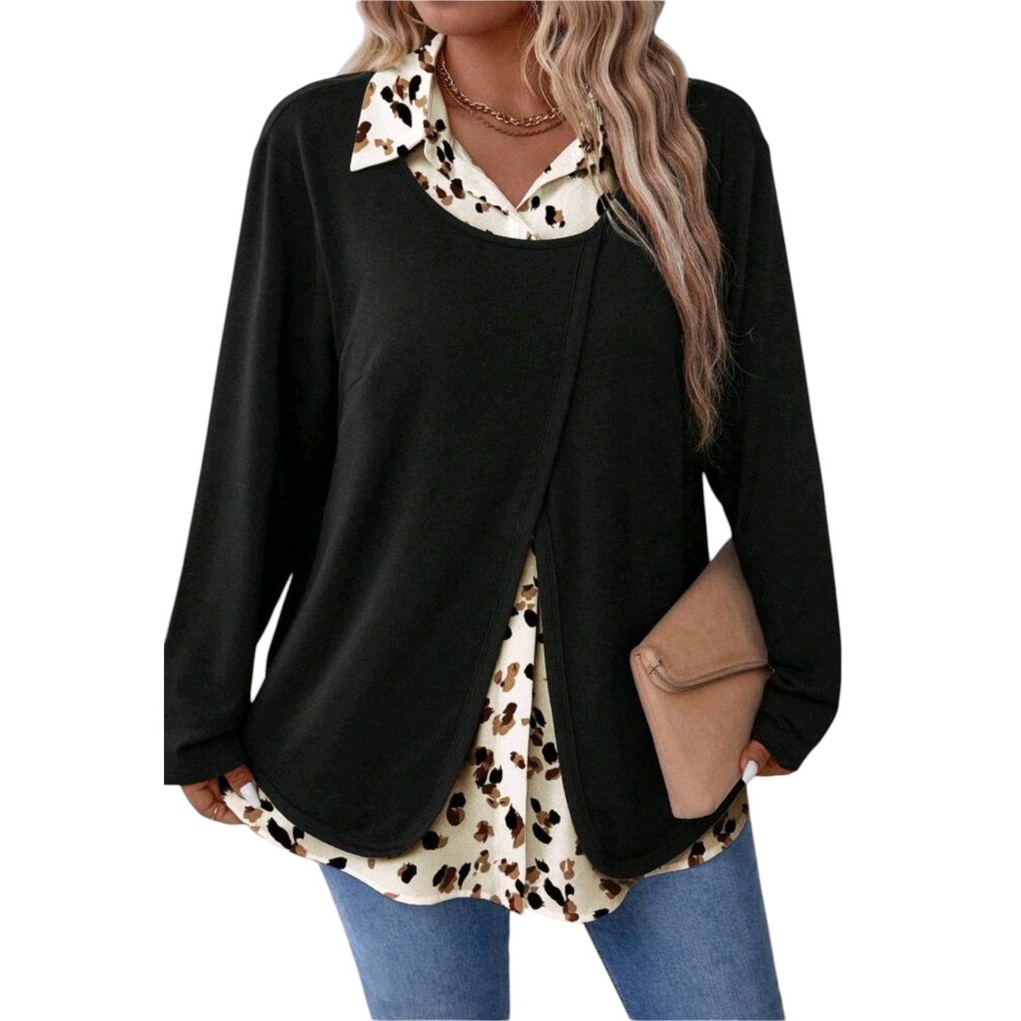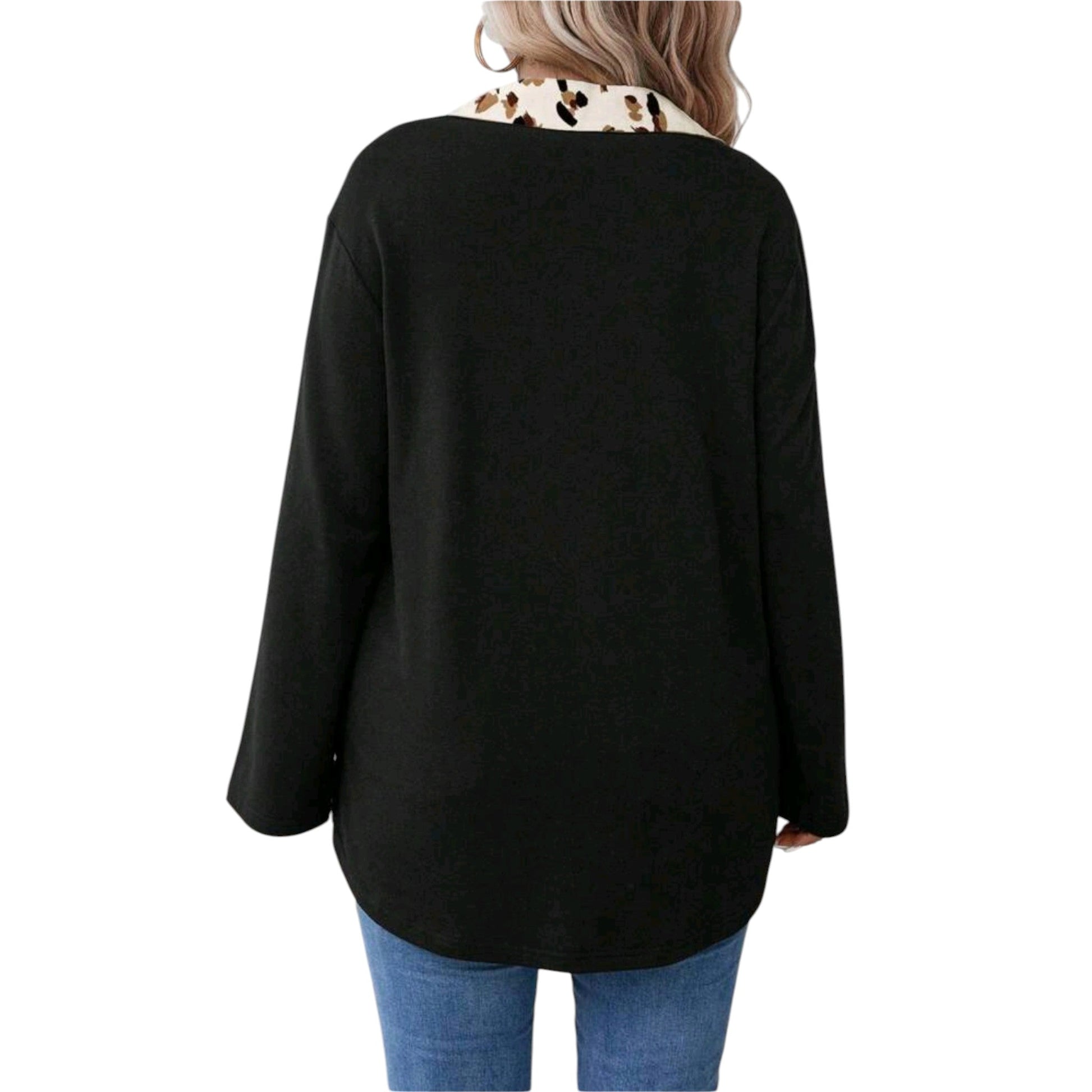 Címke nélküli, fekete, hosszú ujjú, átlapolt hatású felső.