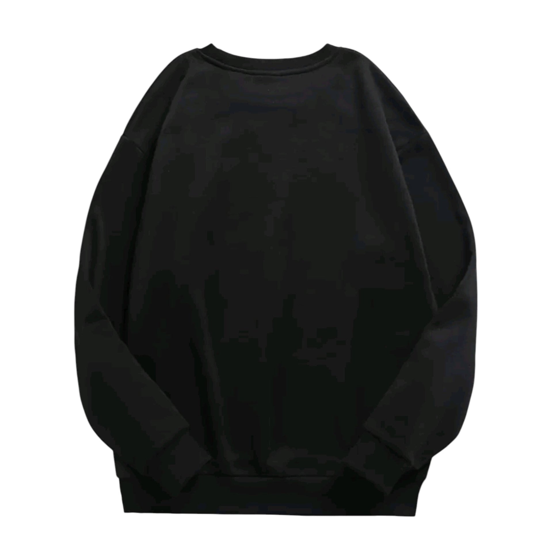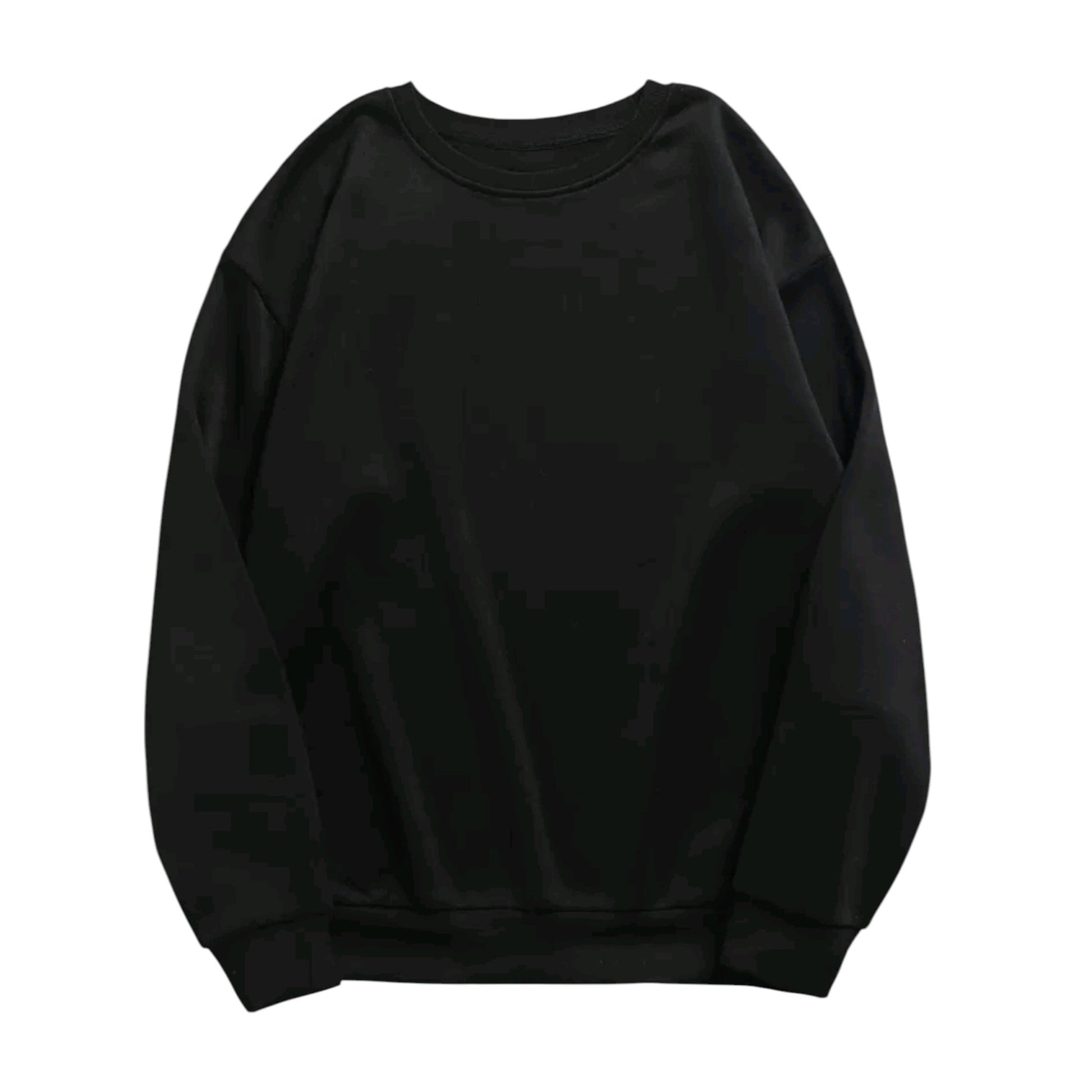 Címke nélküli, fekete, hosszú ujjú, kerek nyakú pulóver.