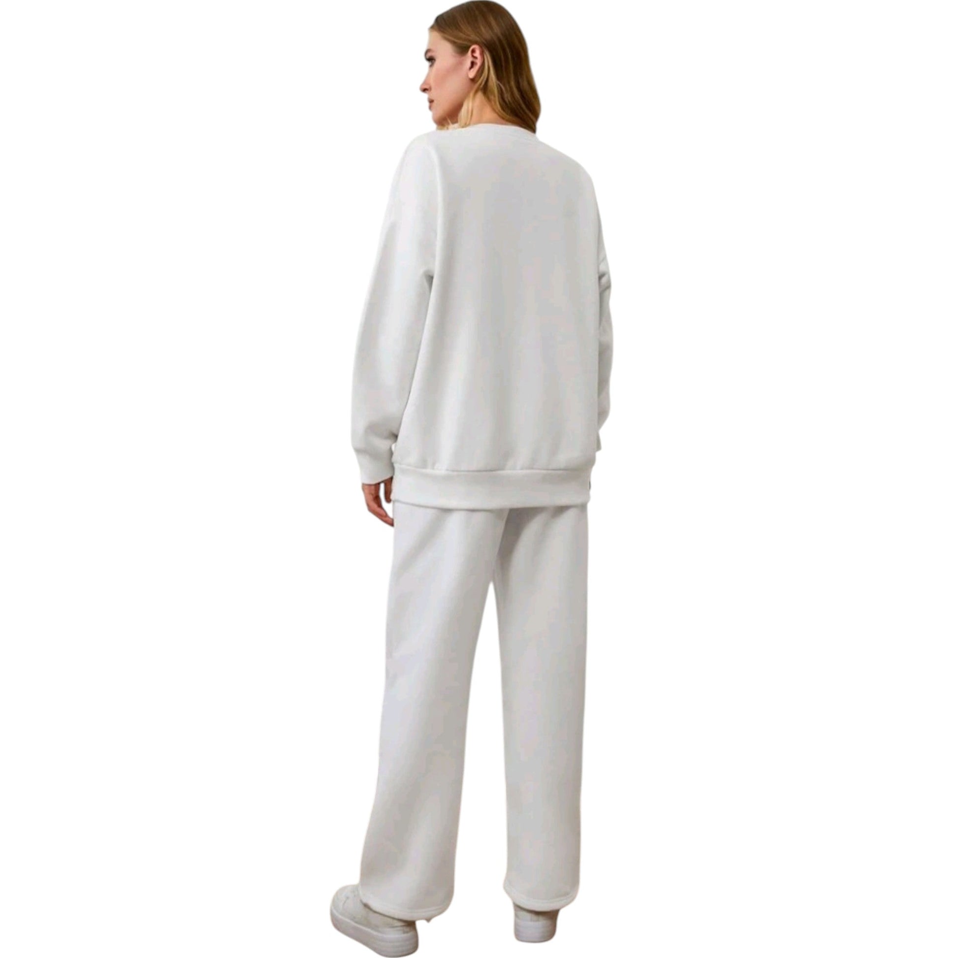 Címke nélküli, fehér, feliratos, hosszú ujjú, kerek nyakú pulóver.