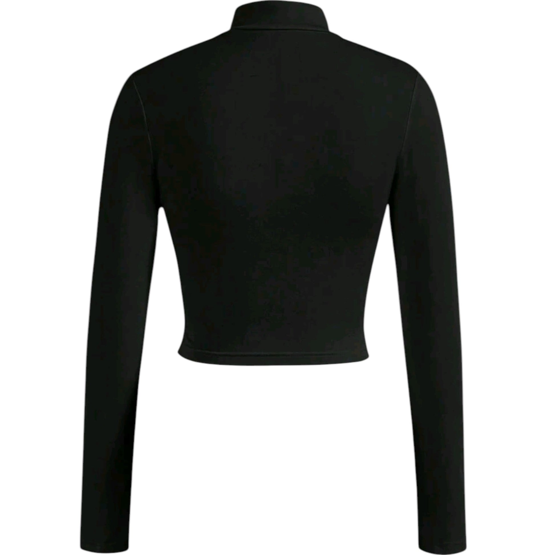 Címke nélküli, fekete, hosszú ujjú, cipzáras, crop top, magas nyakú.