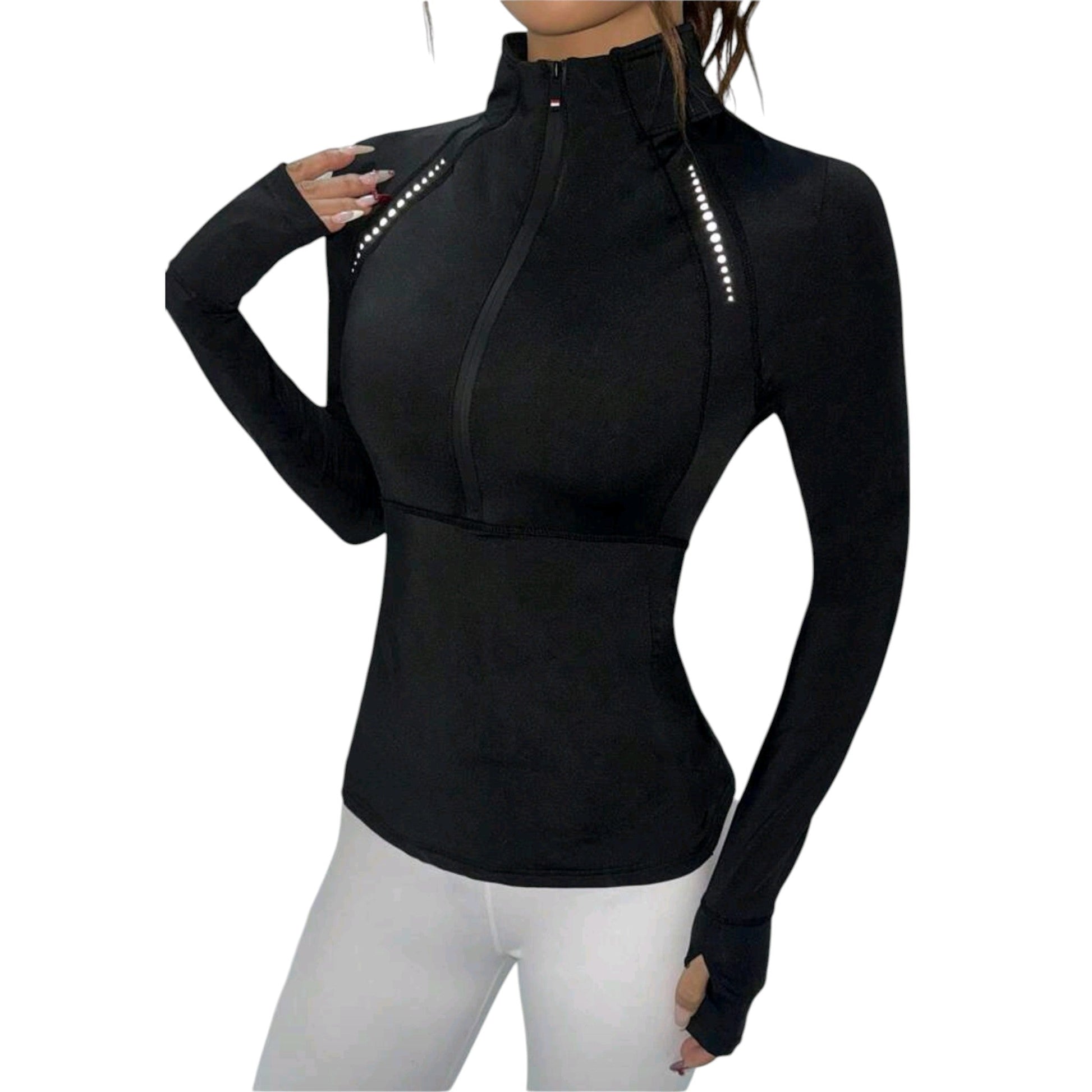Címke nélküli, fekete, hosszú ujjú, cipzáras, magas nyakú, slim fit, fényvisszaverő részletekkel.