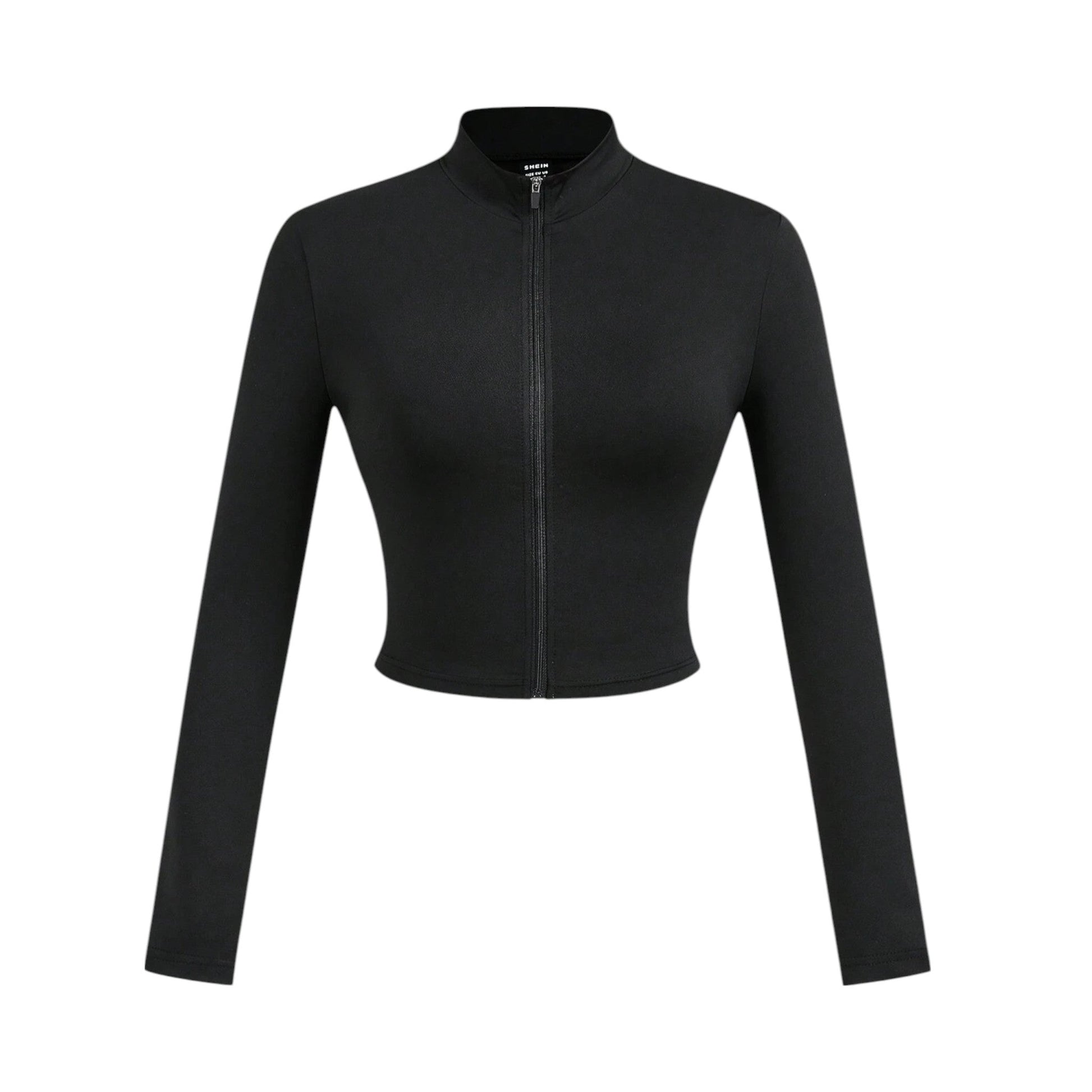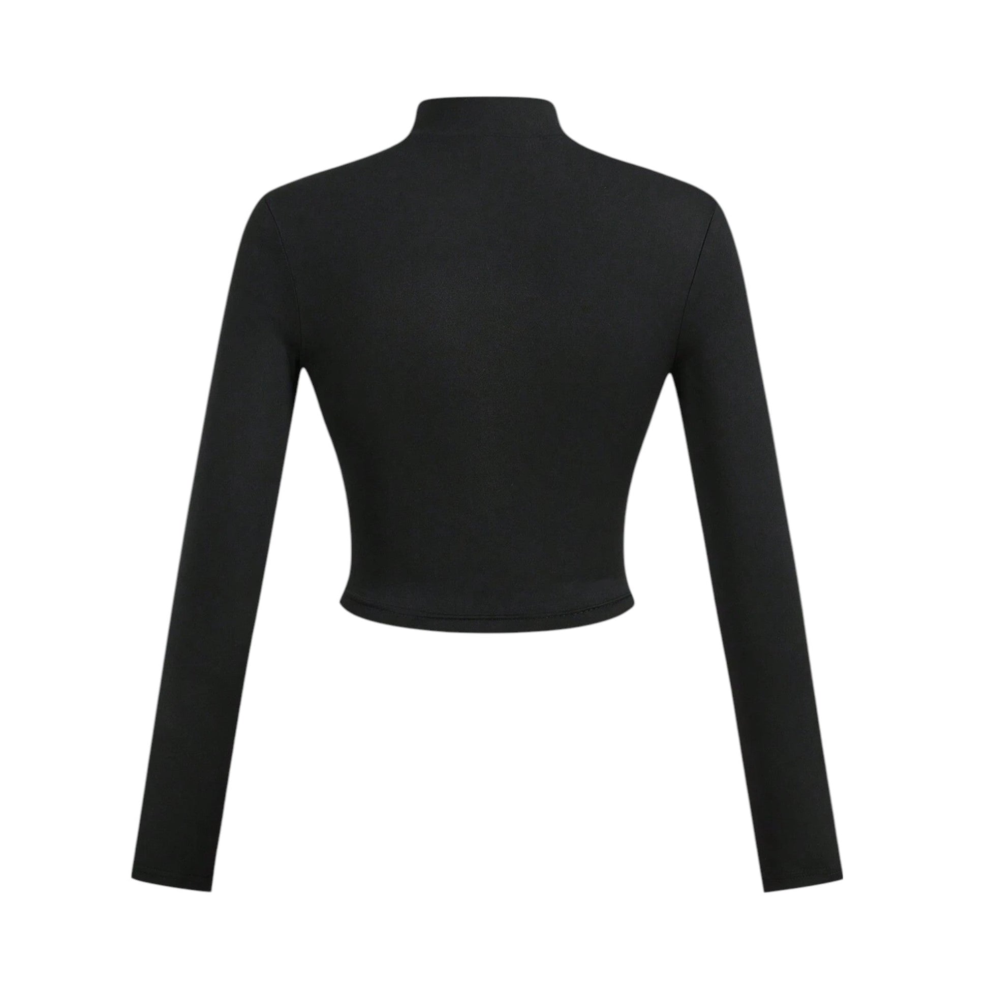 Címke nélküli, fekete, hosszú ujjú, cipzáros, crop top, álló gallérral.