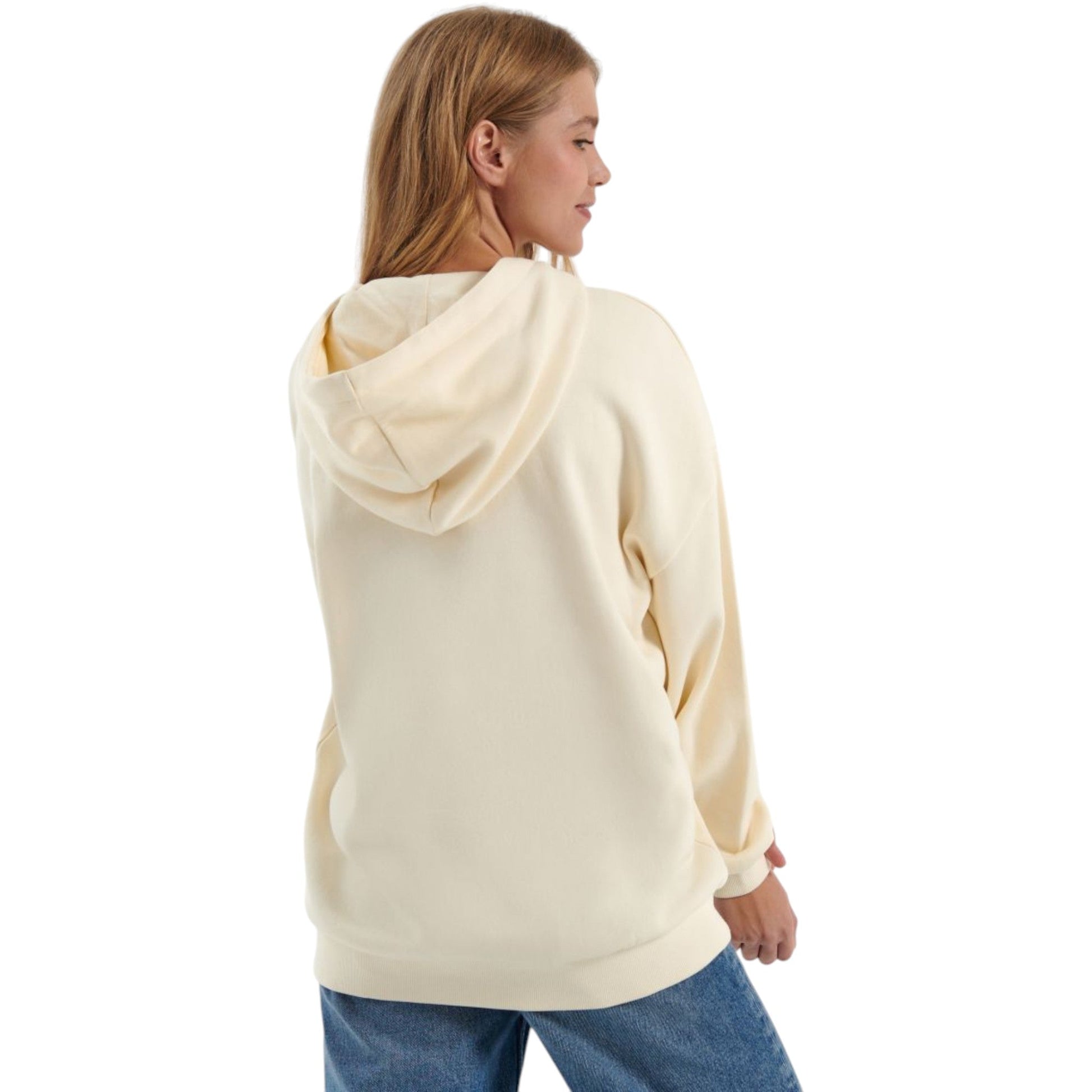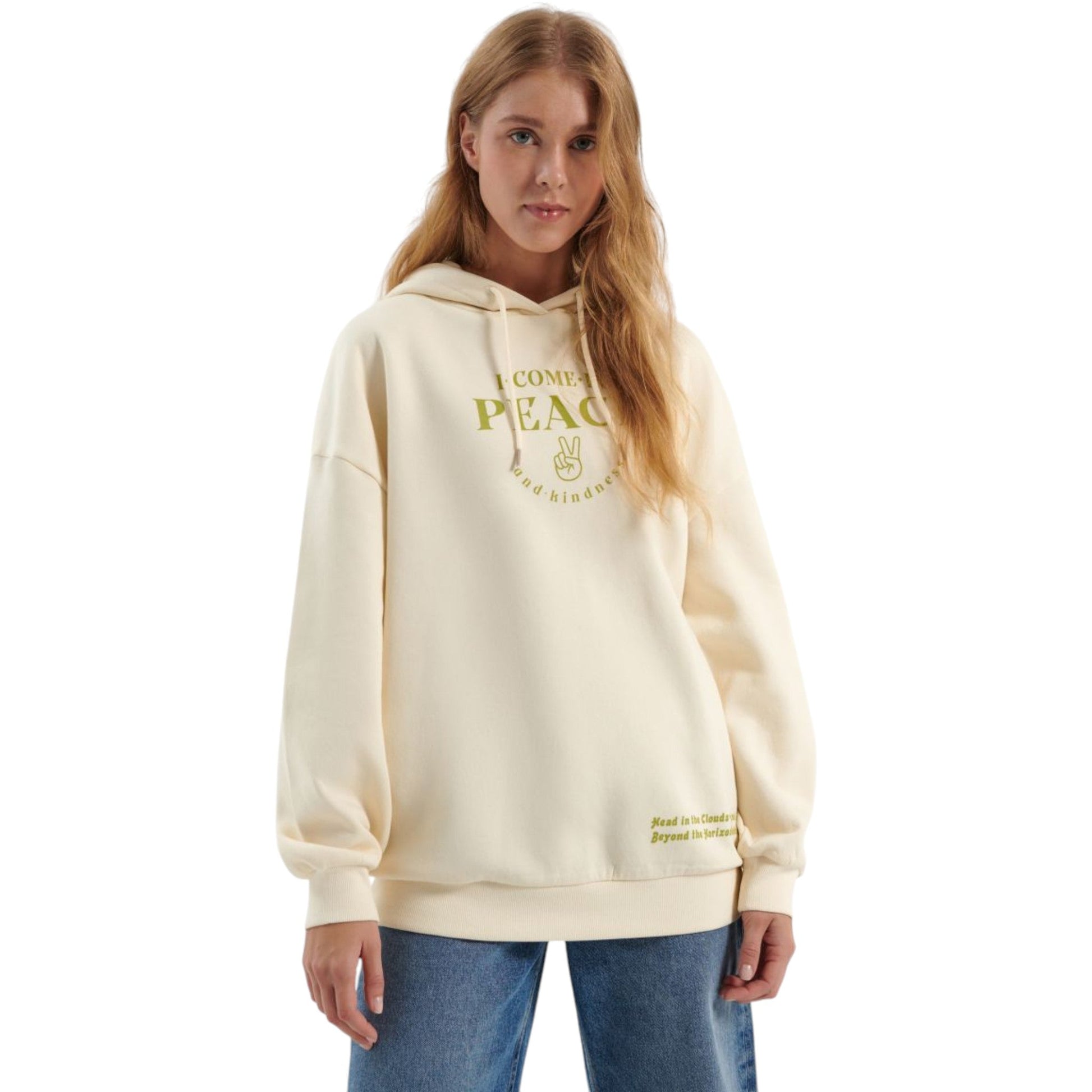 Címke nélküli, krém, hosszú ujjú, kapucnis, oversize szabású, bolyhos belső, mellkasán és alján zöld színű felirattal és béke jellel.