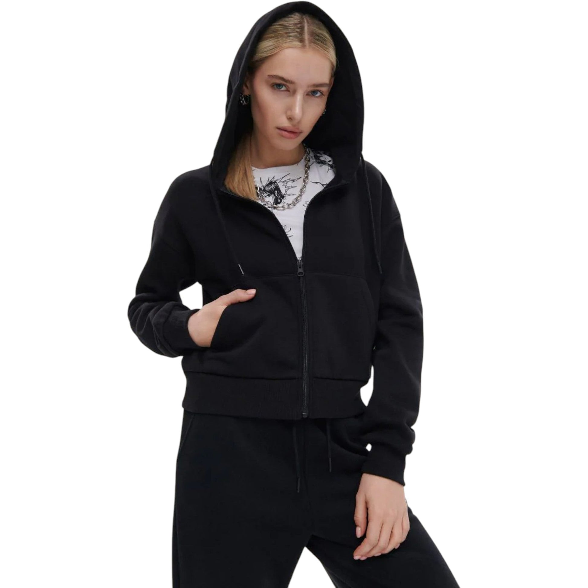 Címke nélküli, fekete, hosszú ujjú, kapucnis, elöl végig cipzáras, alján és mandzsettáján passzés szegély.