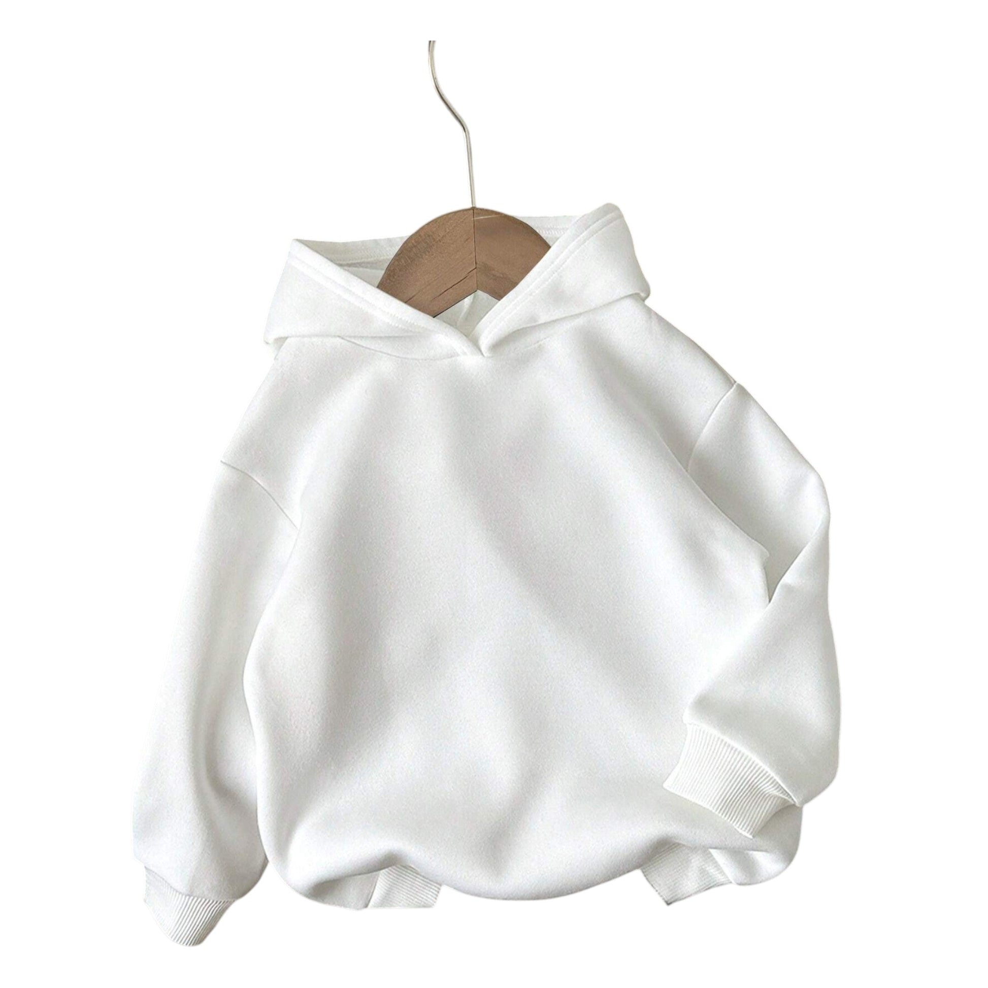 Címke nélküli, fehér, kapucnis pulóver, hosszú ujjú, passzés mandzsettával és aljjal, kenguru zseb nélkül, egyszerű, egyszínű kivitelben.