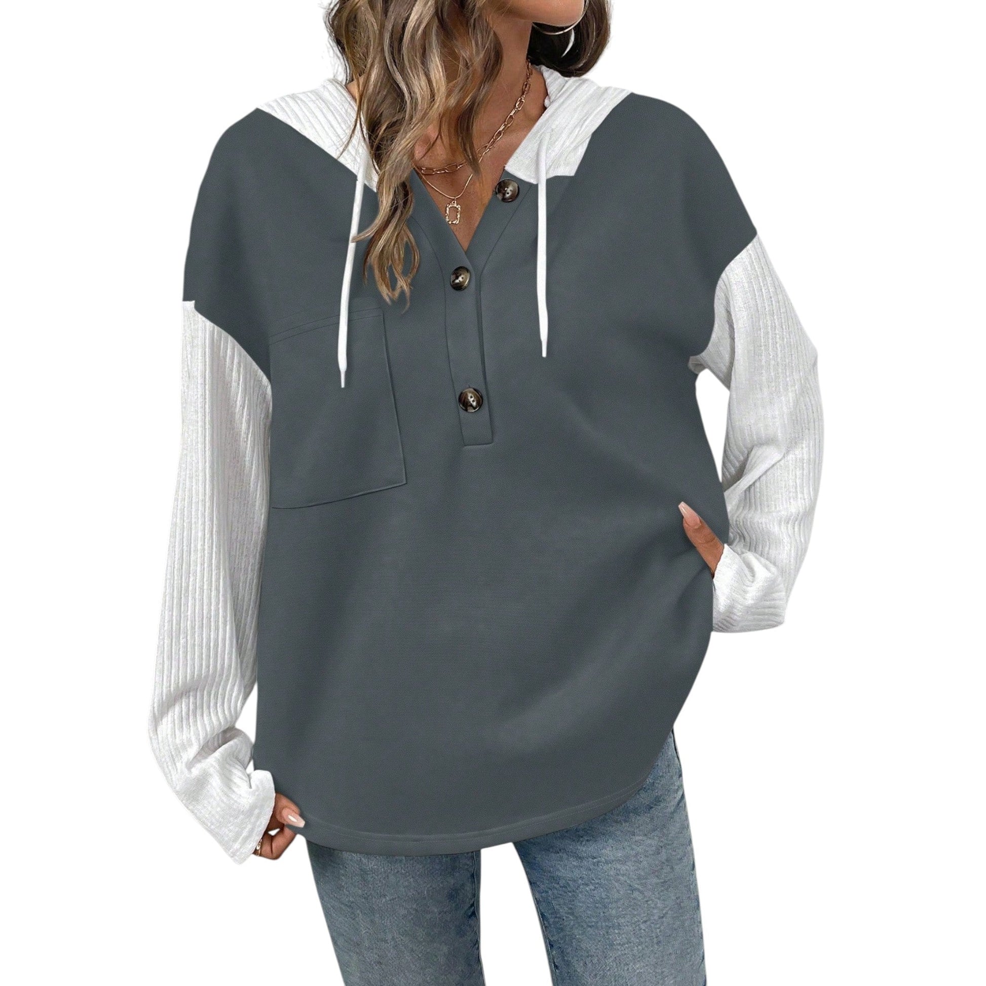 Címke nélküli, szürke és fehér, kapucnis pulóver, V-nyakú, gombos, hosszú, bordázott ujjakkal, elöl zsebbel.