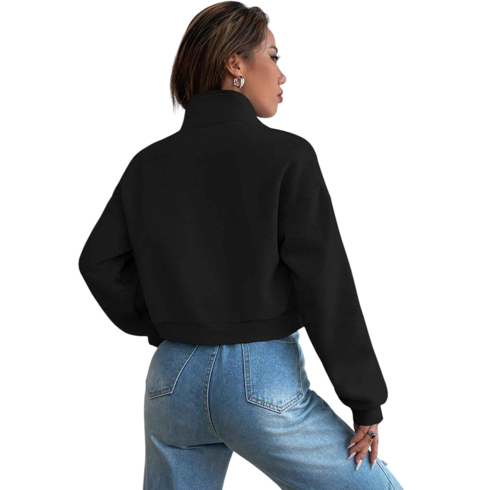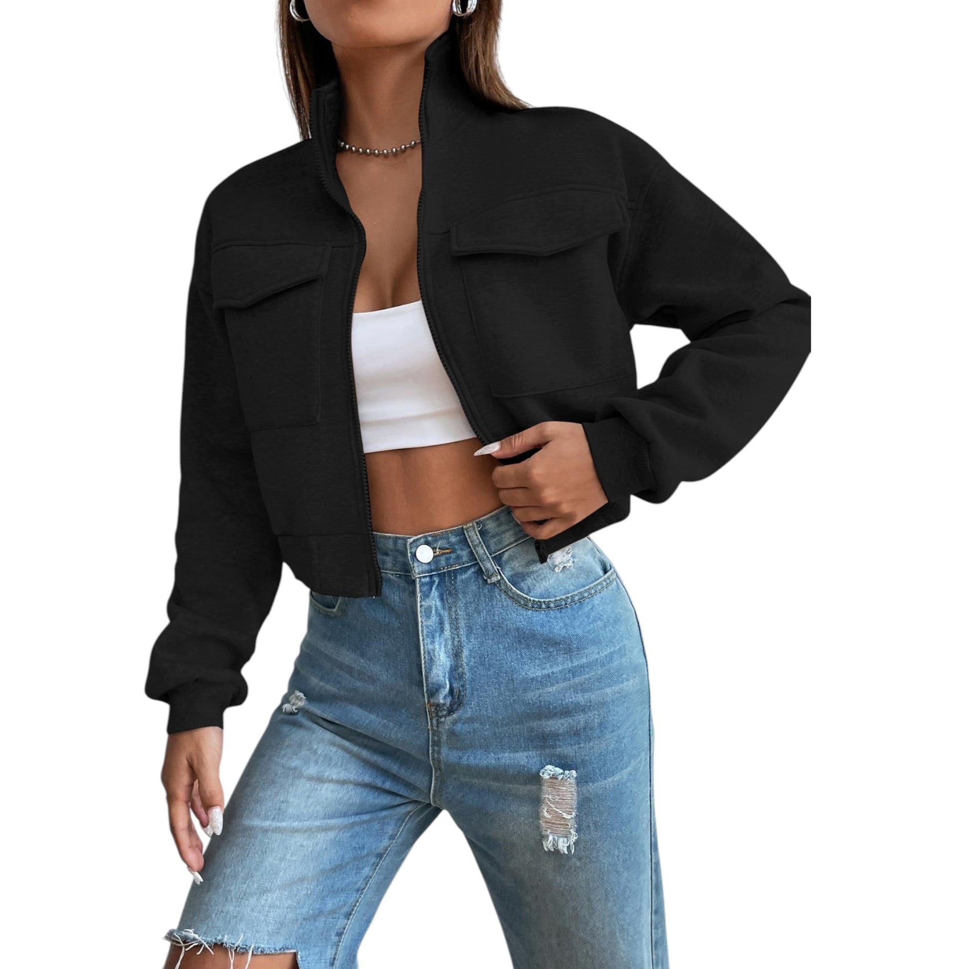Címke nélküli, fekete, crop fazonú dzseki, magas nyakú, cipzáros záródású, hosszú ujjú, elöl két rávarrt zsebbel.