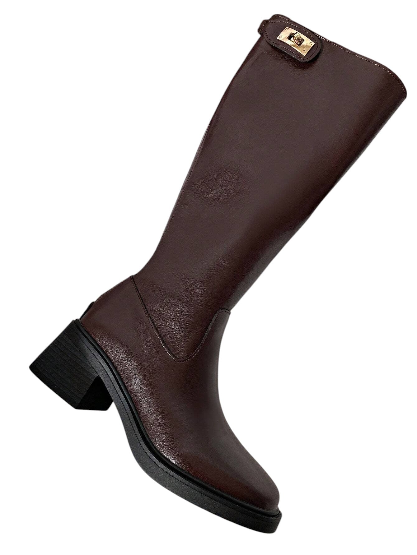 Címke nélküli, sötétbarna műbőr, szögletes orrú, vastag alacsony sarkú, térdcsizma