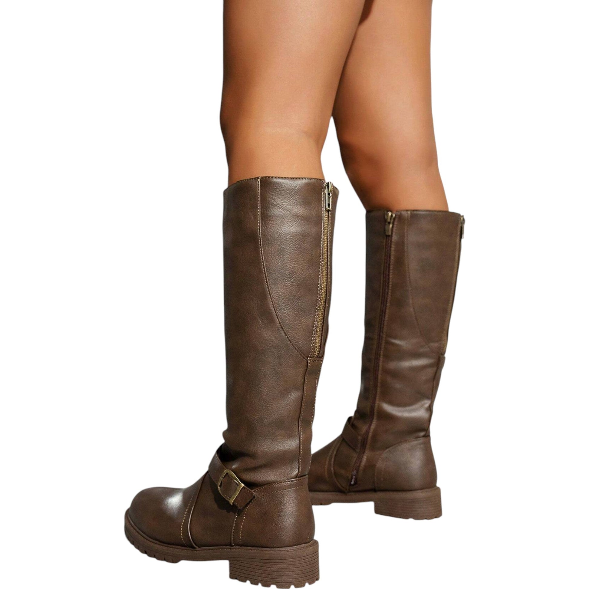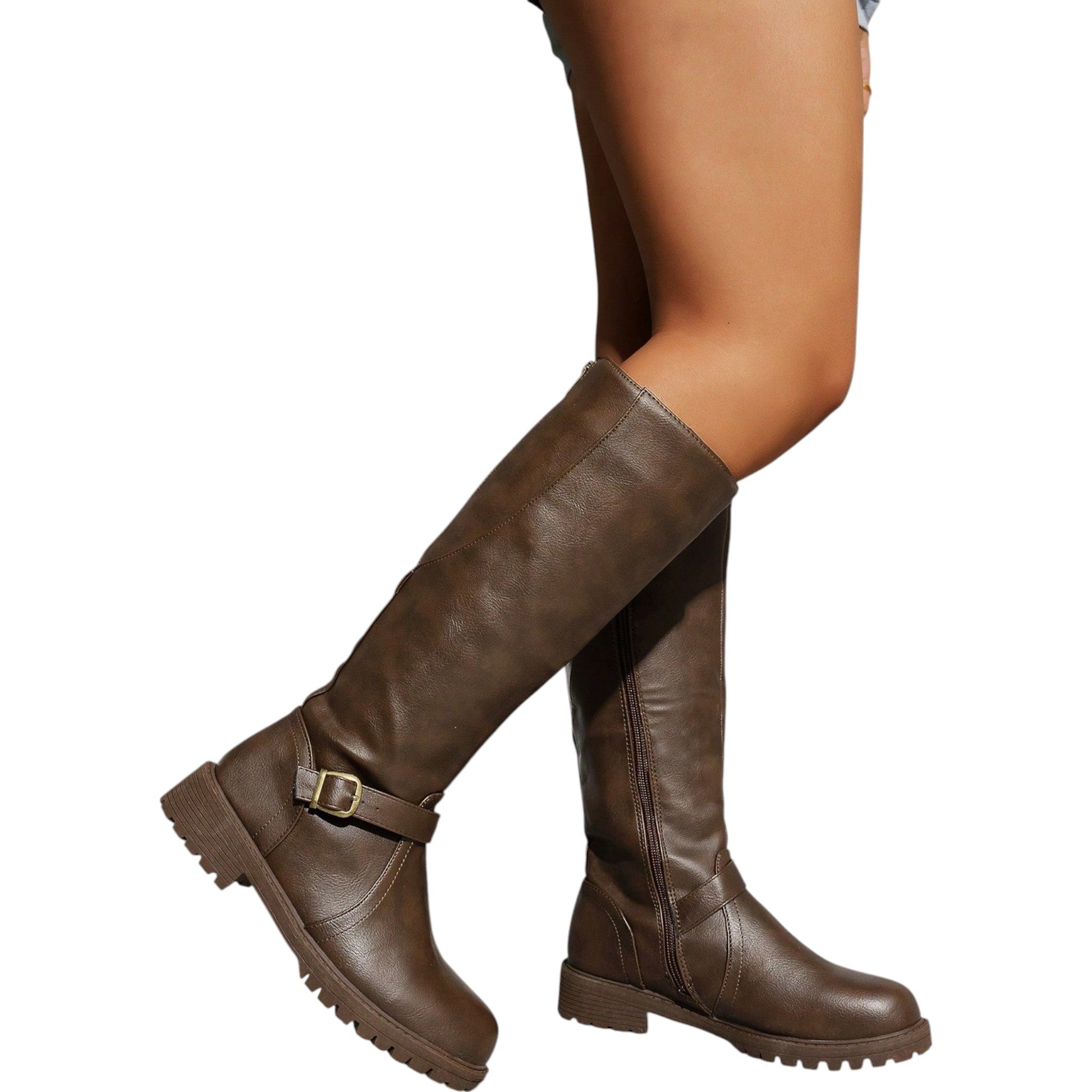 Címke nélküli, barna, térdig érő, vastag talpú, oldalsó cipzáras, csatos díszítéssel. Belső talp hossz: 23cm