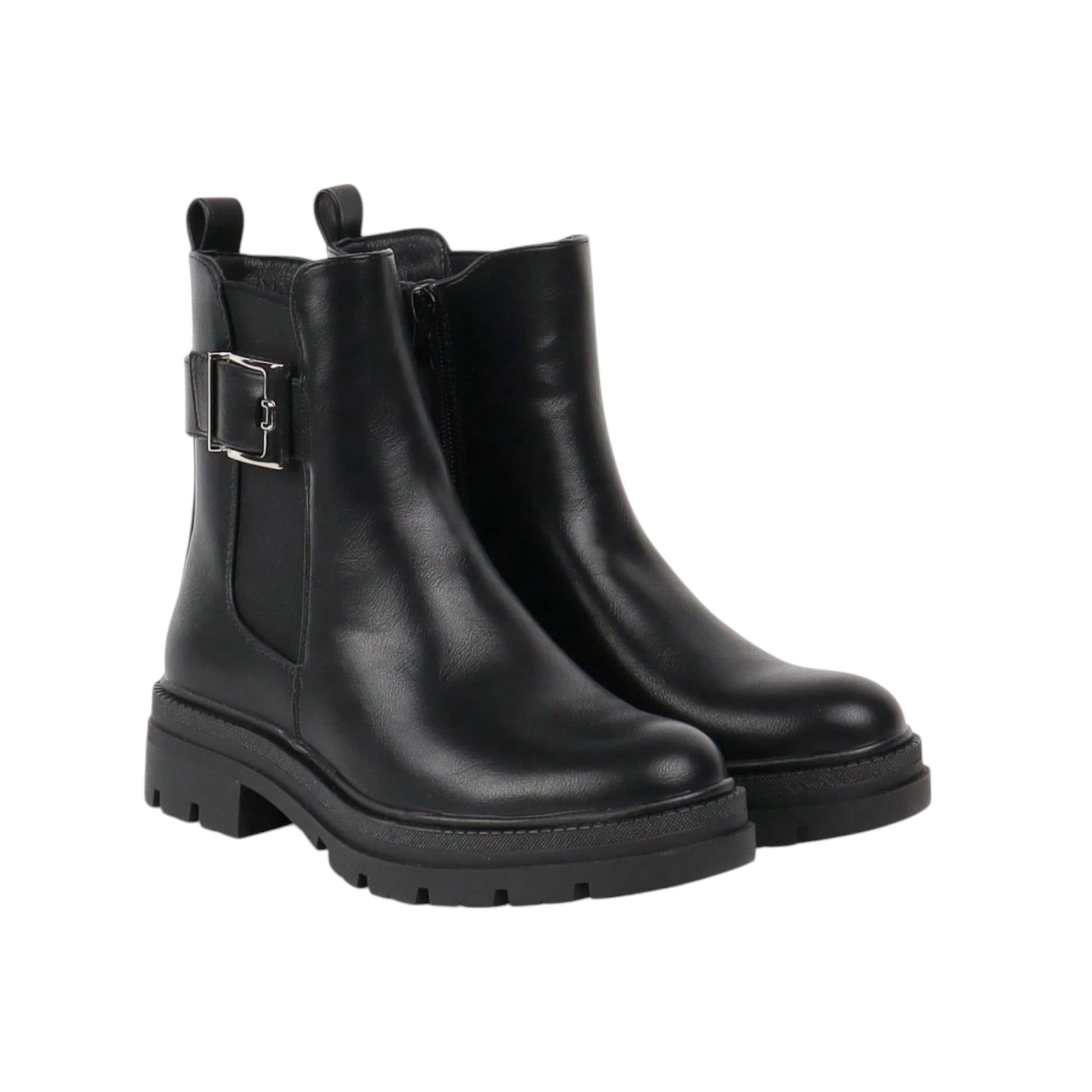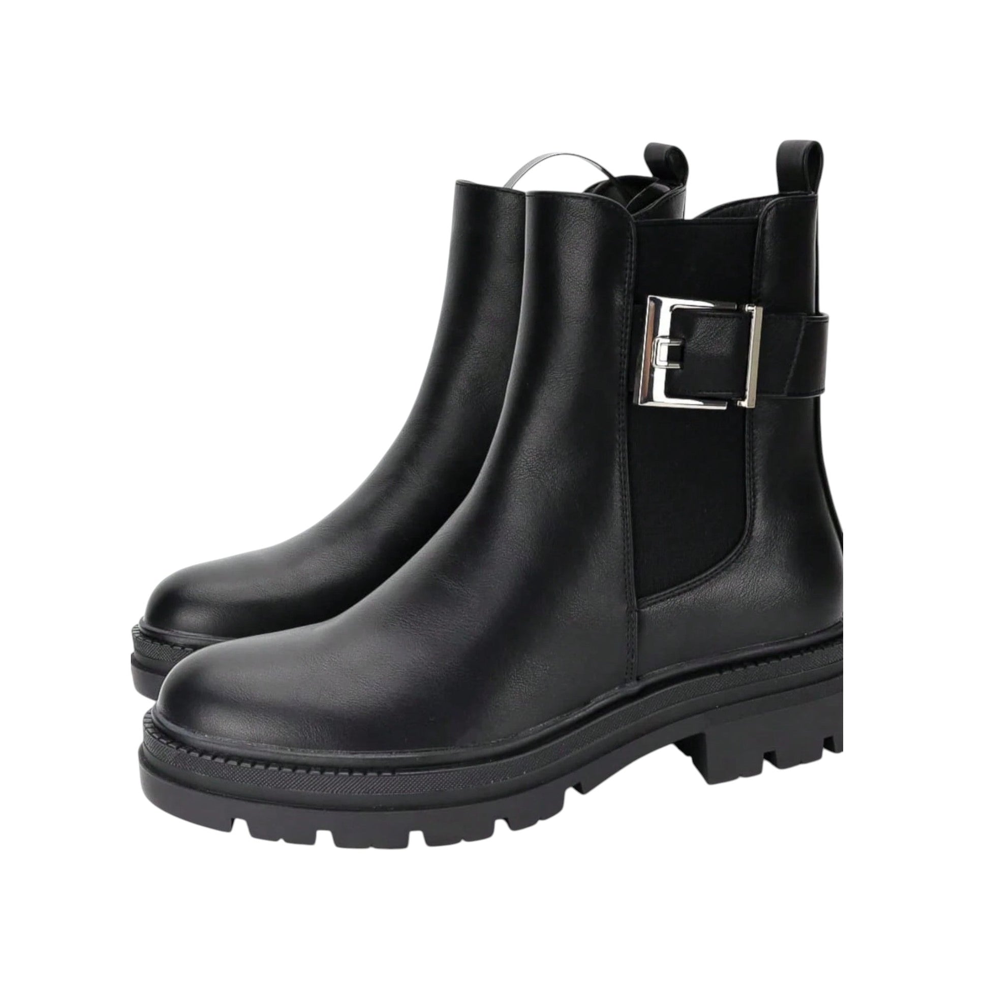Címke nélküli, fekete, chelsea stílusú bokacsizma vastag talppal és oldalsó csattal. Belső talp hossz: 23,5cm