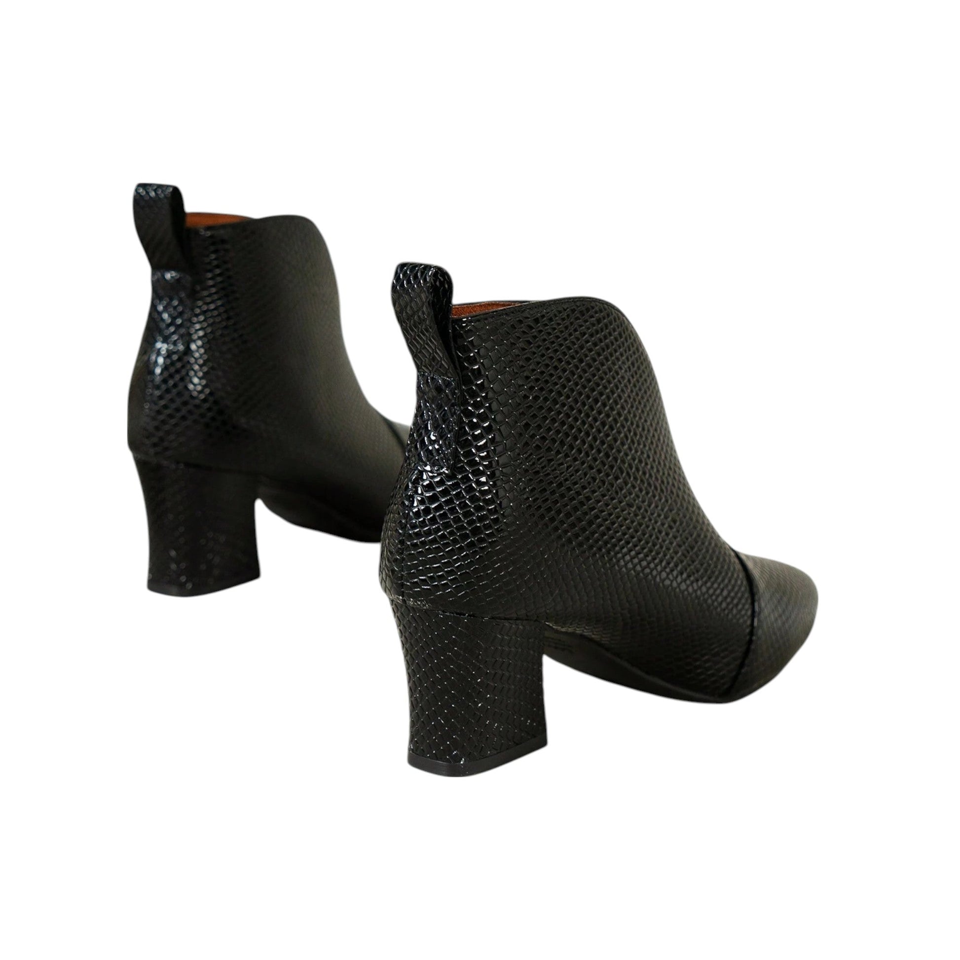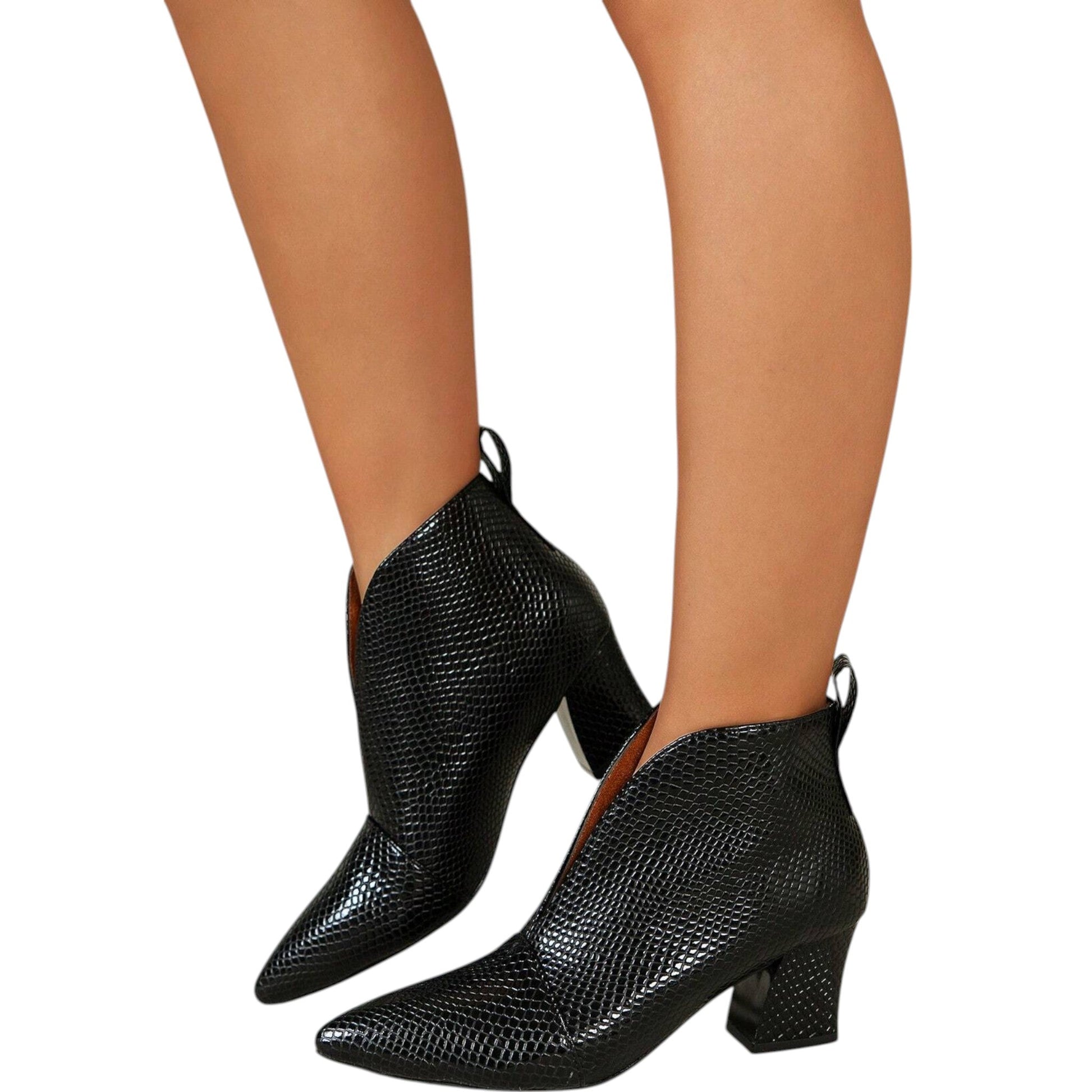 Címke nélküli, fekete színű, kígyómintás bokacsizma, V-kivágással és vastag sarokkal. Belső talp hossz: 26cm