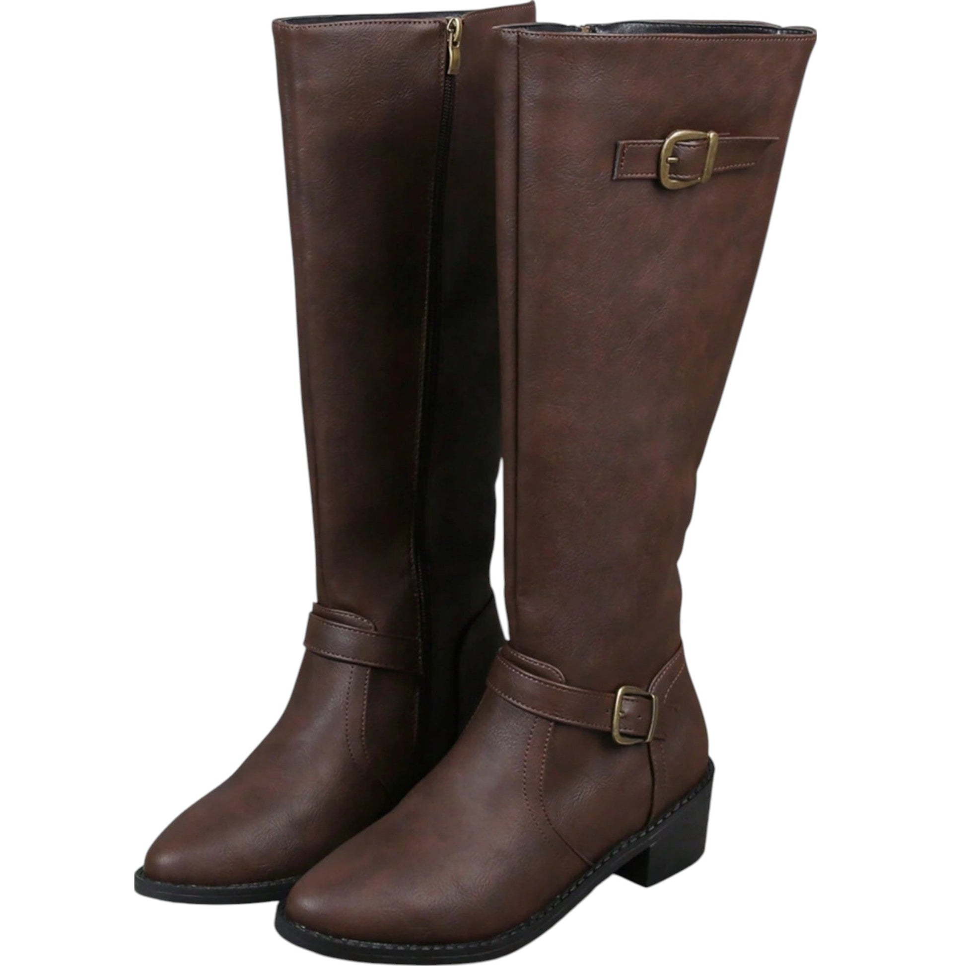 Címke nélküli, barna, térdig érő, oldalsó cipzár, díszítő csat a boka és a felső részen, alacsony sarok, kerek orr.