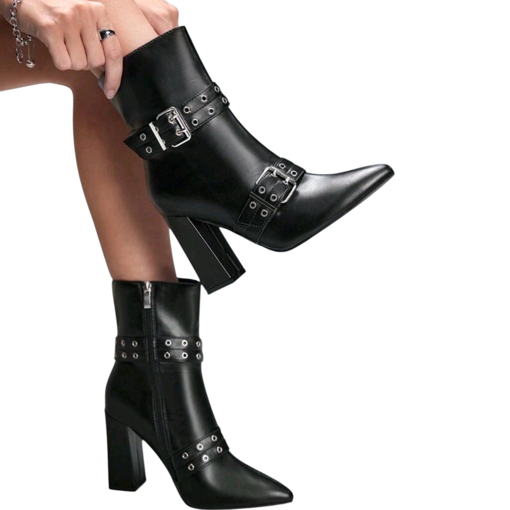 Címke nélküli, fekete, hegyesorrú, blokksarkú, csatos díszítésű, cipzáras bokacsizma. Belső talp hossz: 25,5cm