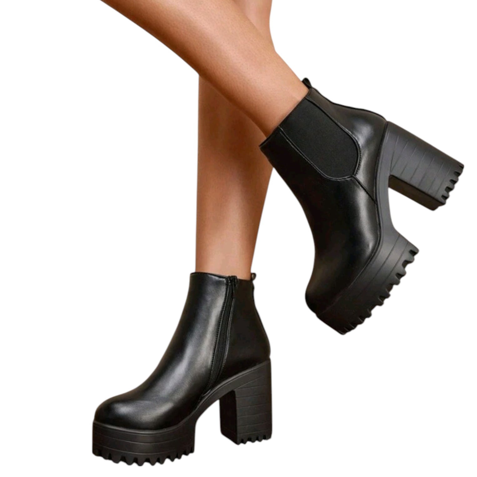 Címke nélküli, fekete, vastag platform talpú, blokksarkú, cipzáras bokacsizma. Belső talp hossz: 23,5cm