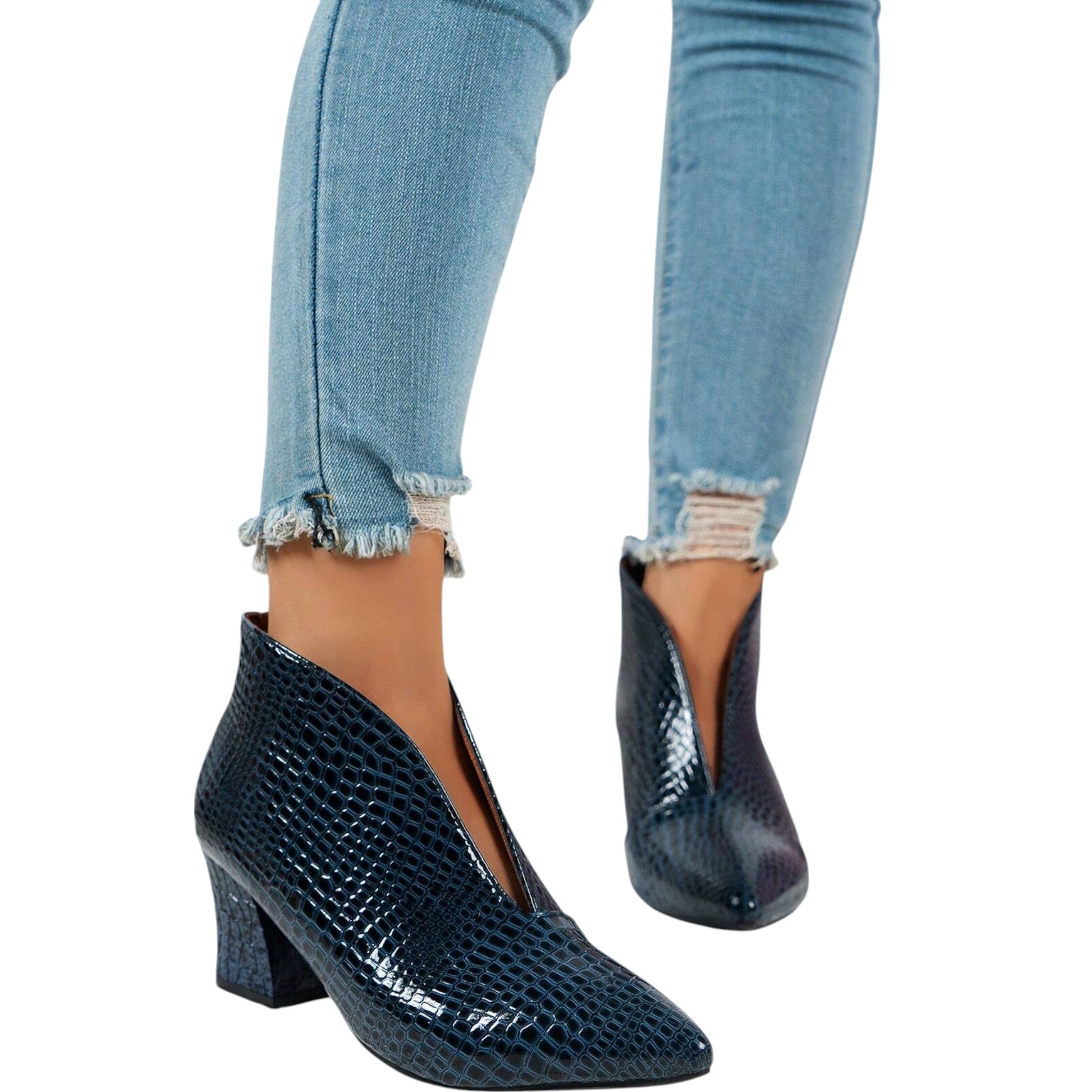 Címke nélküli, sötétkék, dombornyomott krokodilbőr mintázat, mély V-kivágás elöl, tömb sarok, hegyes orr.