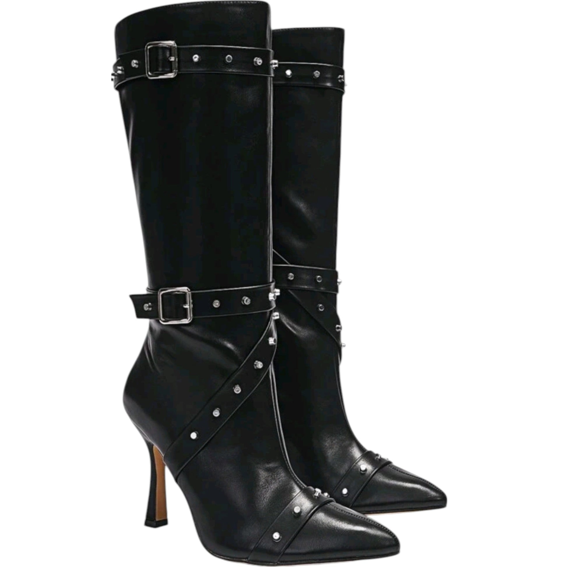 Címke nélküli, fekete, magas szárú, hegyesorrú, tűsarkú, csatos és szegecses díszítésű csizma. Belső talp hossz: 23cm