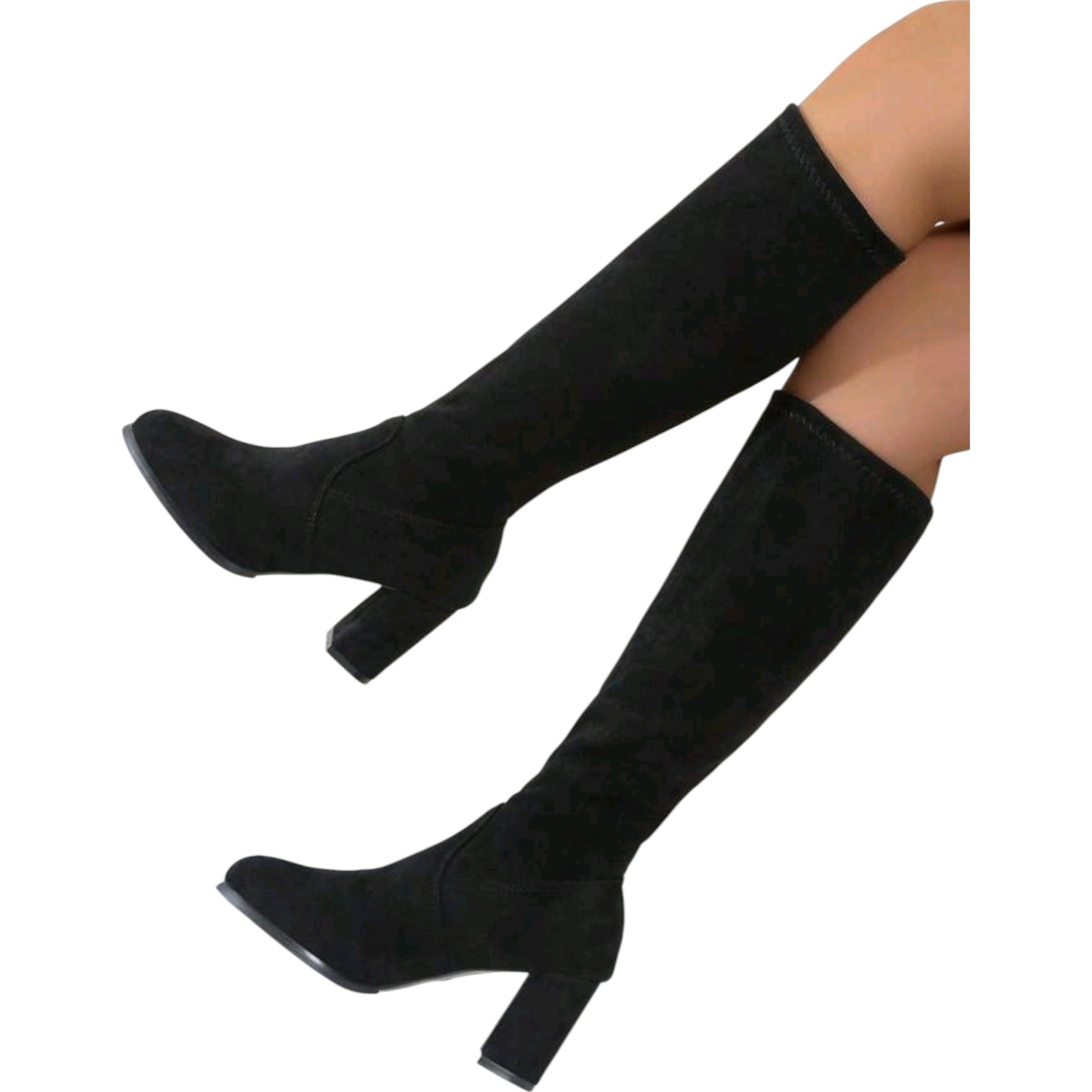 Címke nélküli, fekete, térdig érő, vastag sarokkal, hegyes orrú.