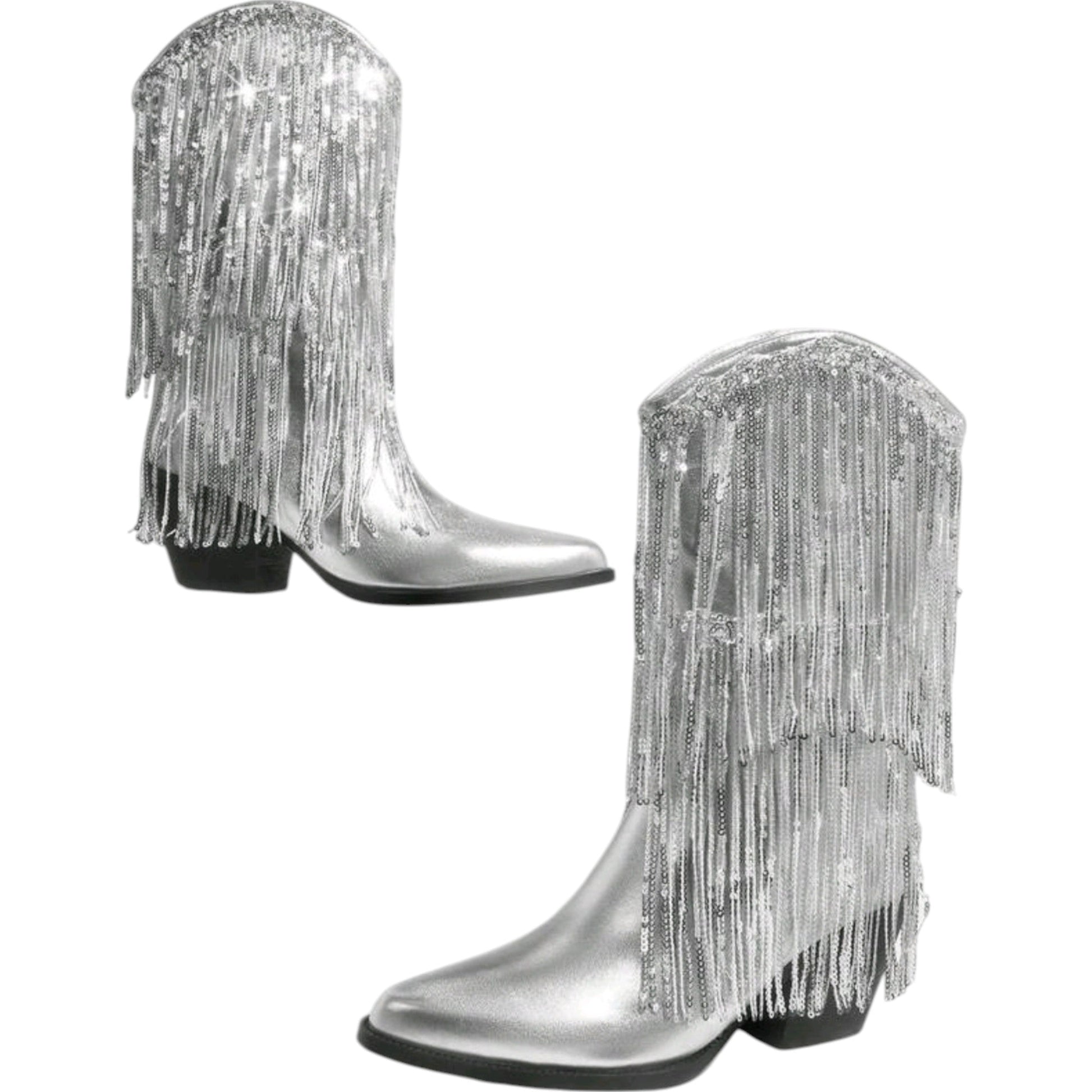 Címke nélküli, ezüst, rojtos, hegyes orrú, alacsony sarokkal.