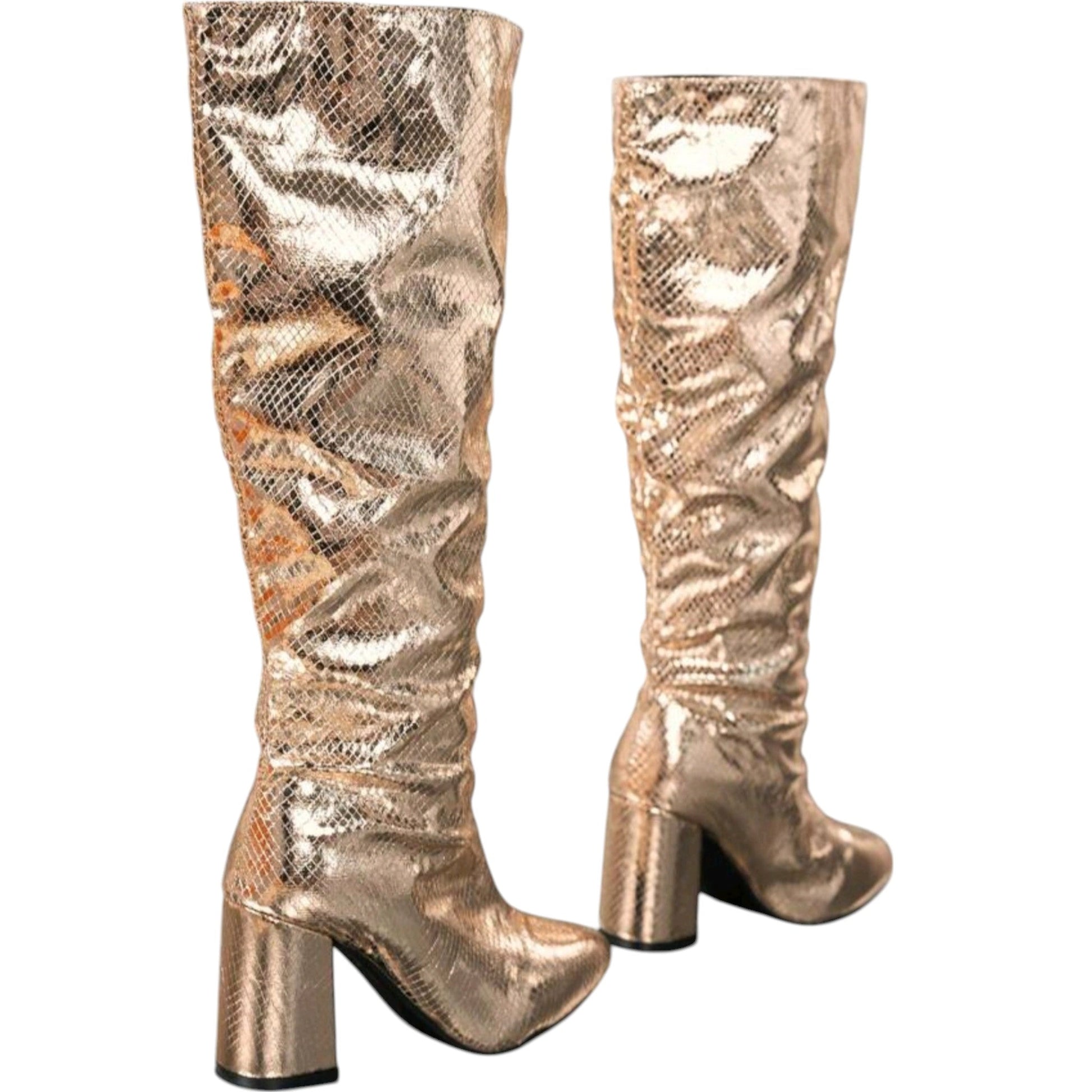 Címke nélküli, arany színű, térdig érő, gyűrött hatású, blokksarkú csizma. Belső talp hossz: 19cm
