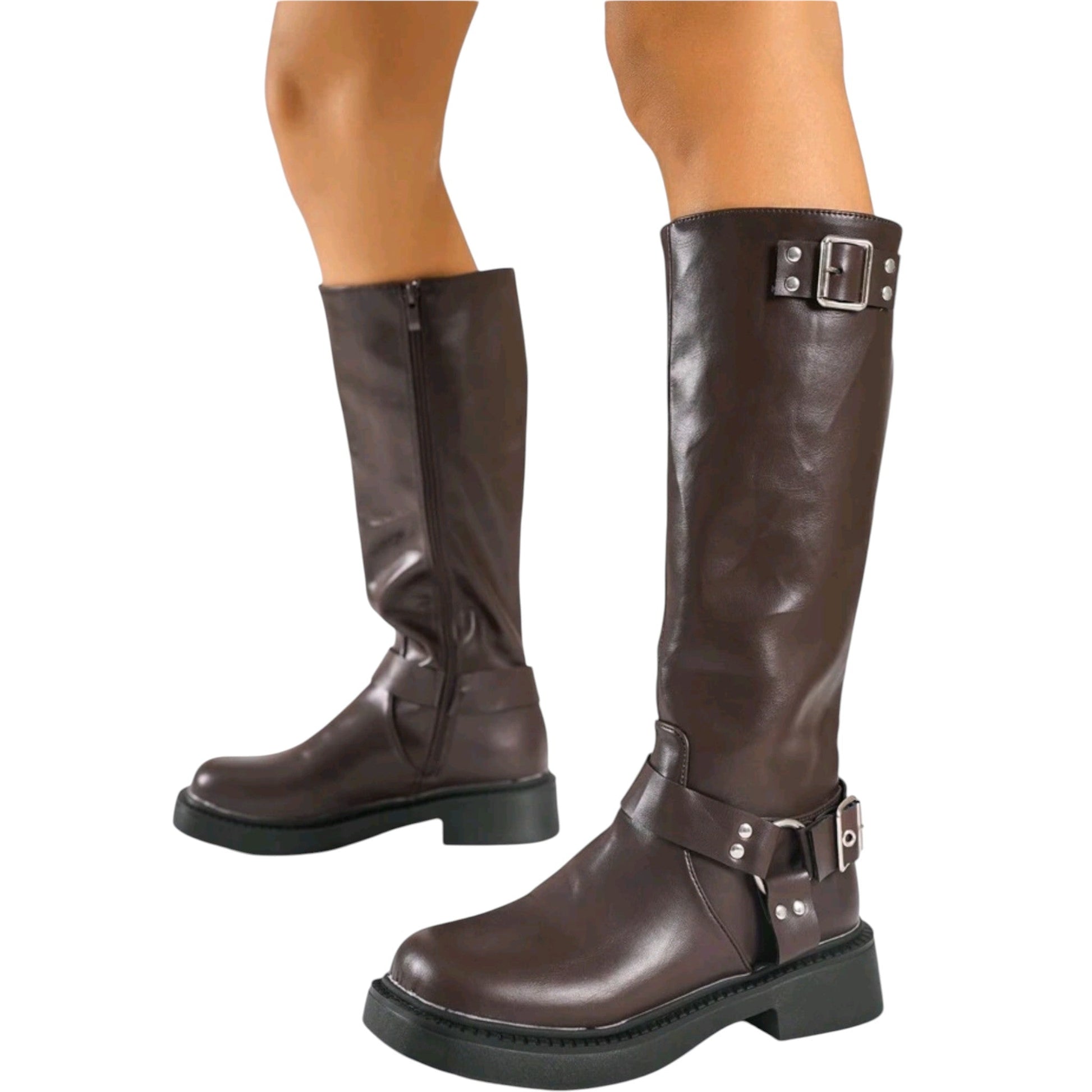 Címke nélküli, barna, csatos, térdig érő csizma, vastag talppal és sarokkal, cipzárral az oldalán. Belső talp hossz: 24,5cm
